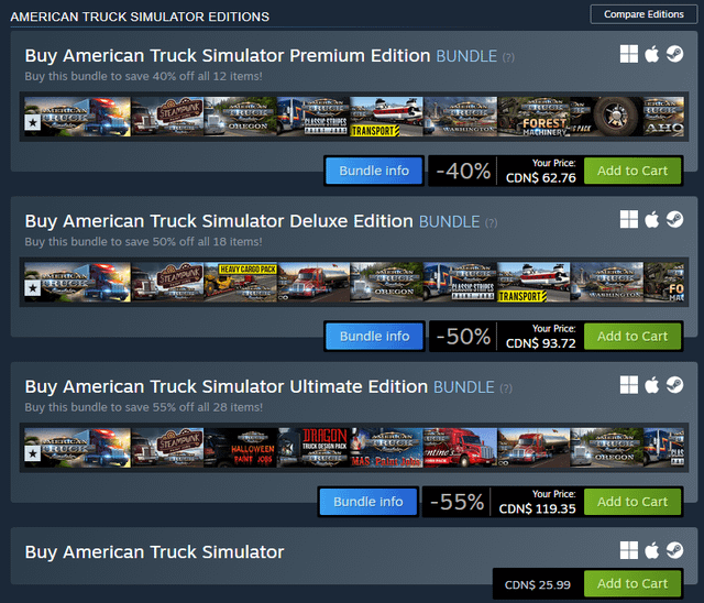 The search results always show you the cheapest possible buying options. Sometimes that option happens to be a bundle with a personalized discount. And sometimes a game is part of so many bundles that it doesn’t show them all unless you [go to the bundles list](https://store.steampowered.com/bundlelist/270880/American_Truck_Simulator).
