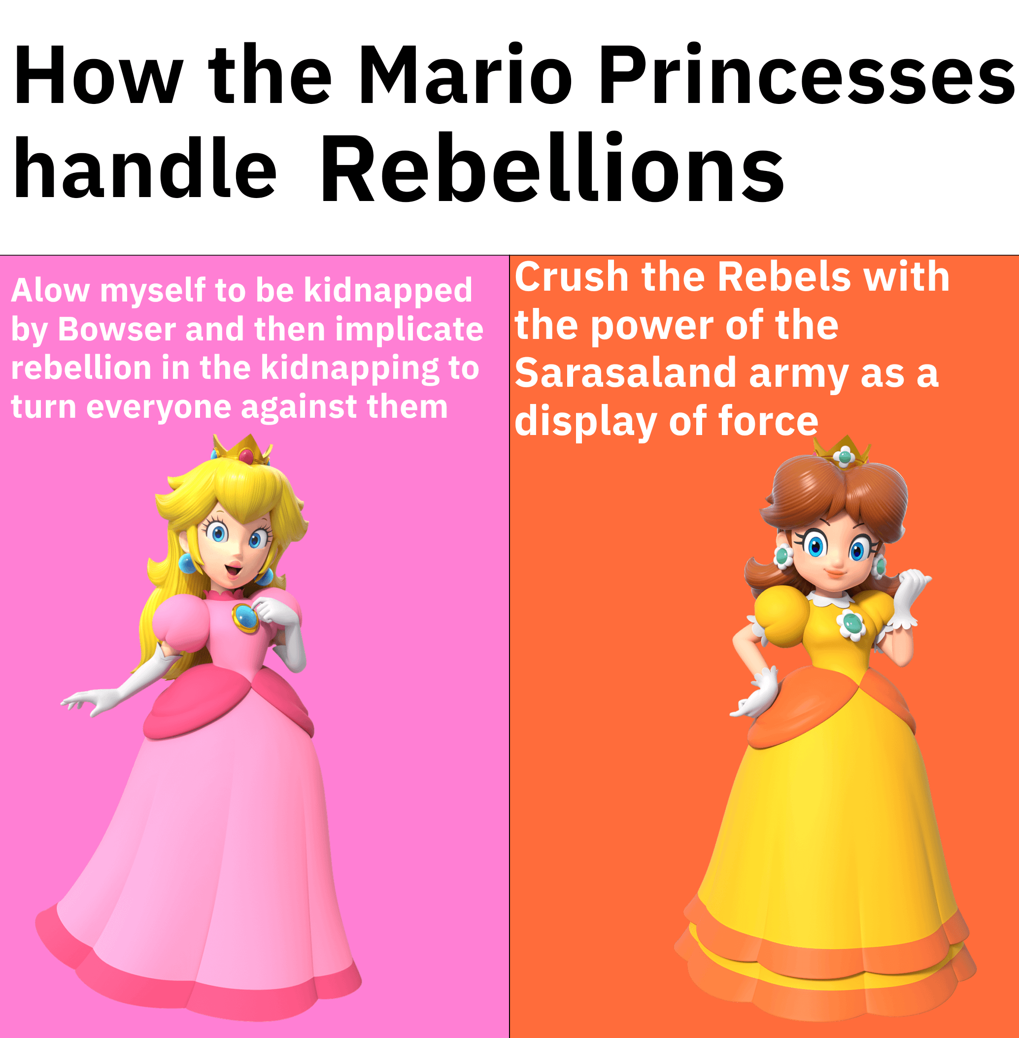 Currently workshopping an AU where Peach is a Morally Gray ruler who schemes to establish a utopian world peace, Allows herself to be kidnapped by Bowser to push her agenda and dearly loves the Toads, wants the best for them and is willing to cross a lot of lines for them.