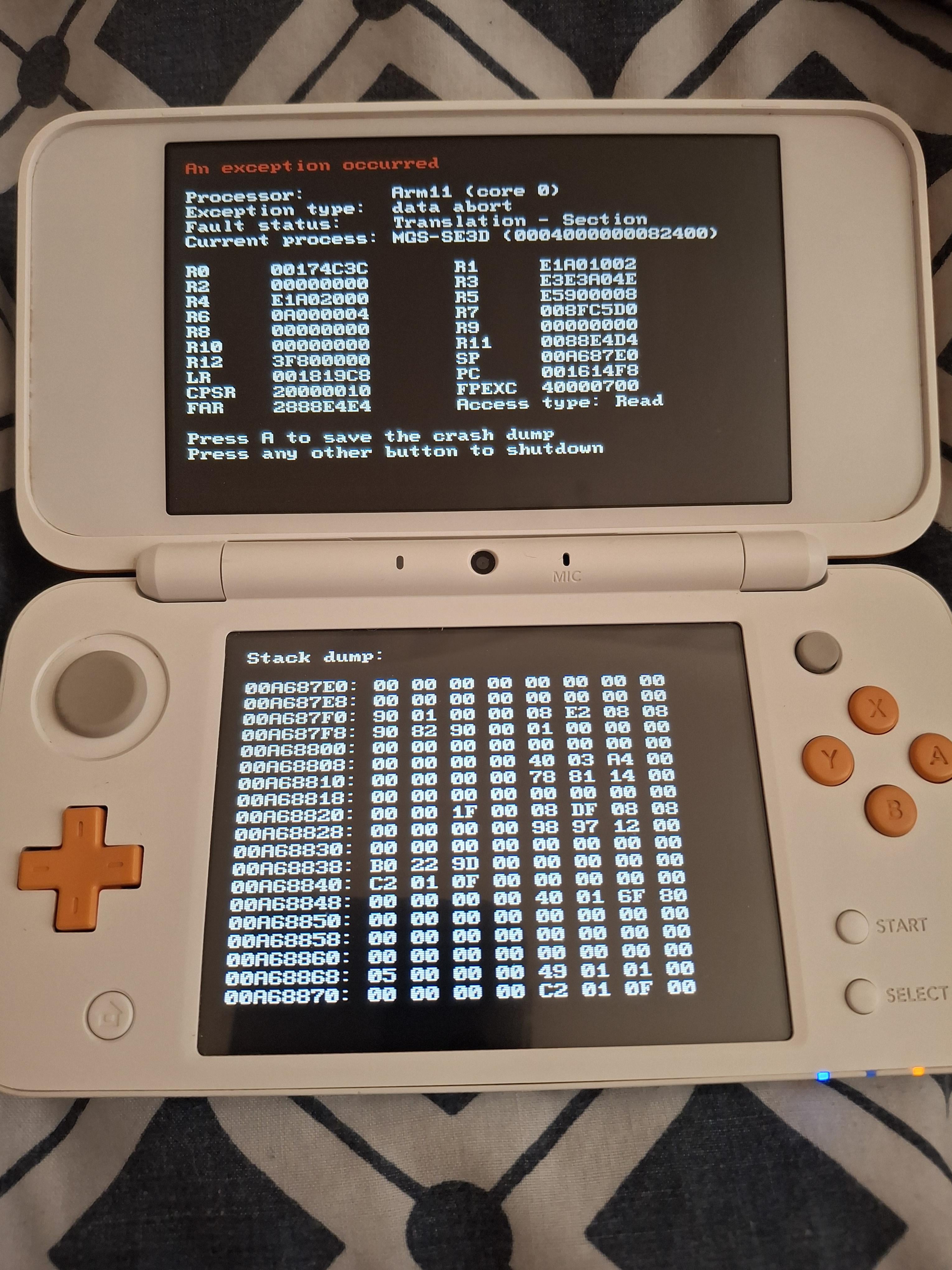This might be an issue that's prevalent with many 3DS titles but so far, I've only experienced it with Metal Gear Solid 3D (I only installed homebrew (Luma) on my N2DS yesterday, so haven't played many games yet). Basically, I reach a certain point quite early in the game where the screen fades to black – between the end of a cutscene and before the opening titles are supposed to play – and I am prompted to save the game. At this point, the game will crash when I select an input.