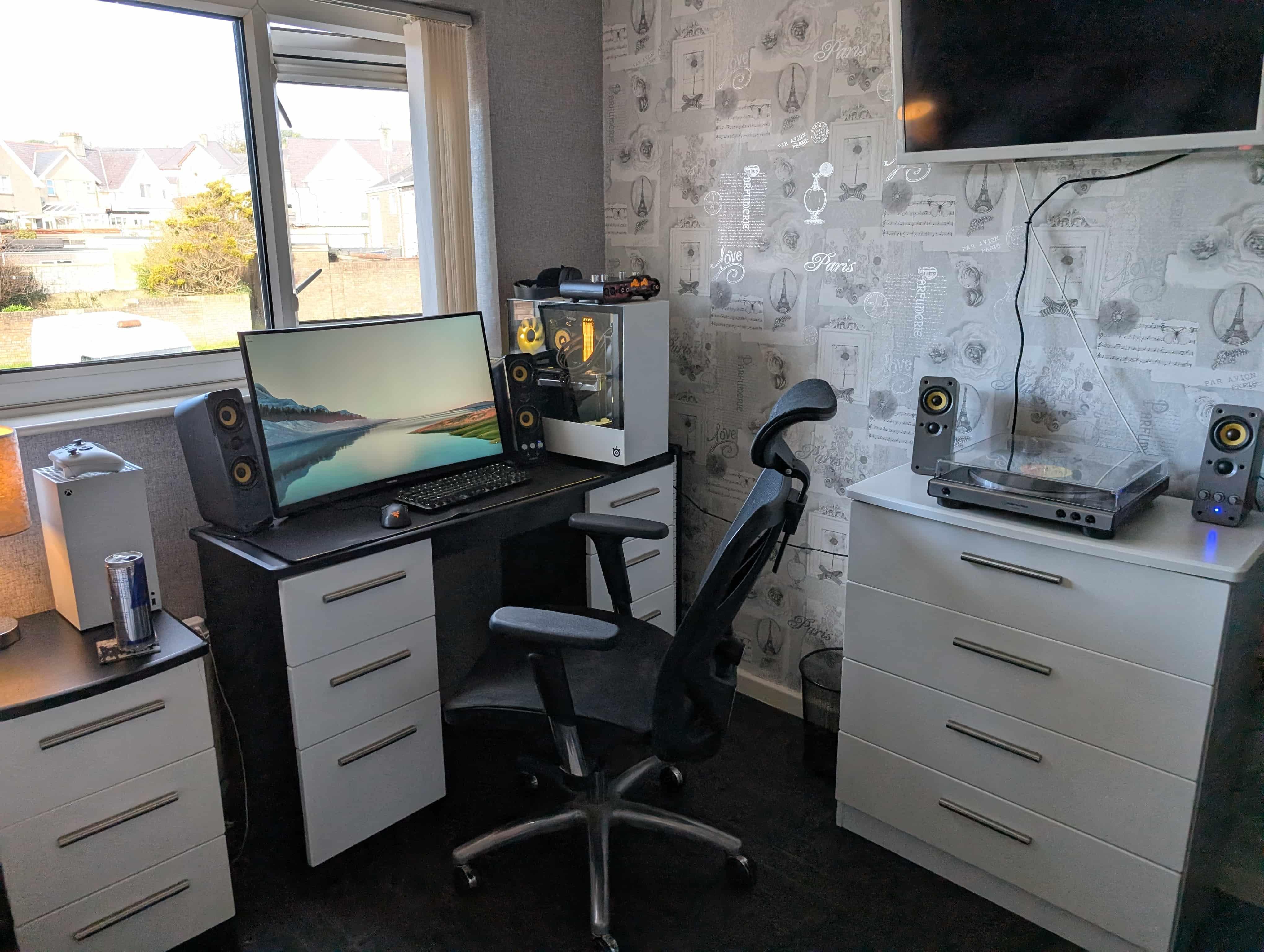 My sister's old room explains the wallpaper and vanity table desk also I need a monitor stand Posted by Ok-Tell5048