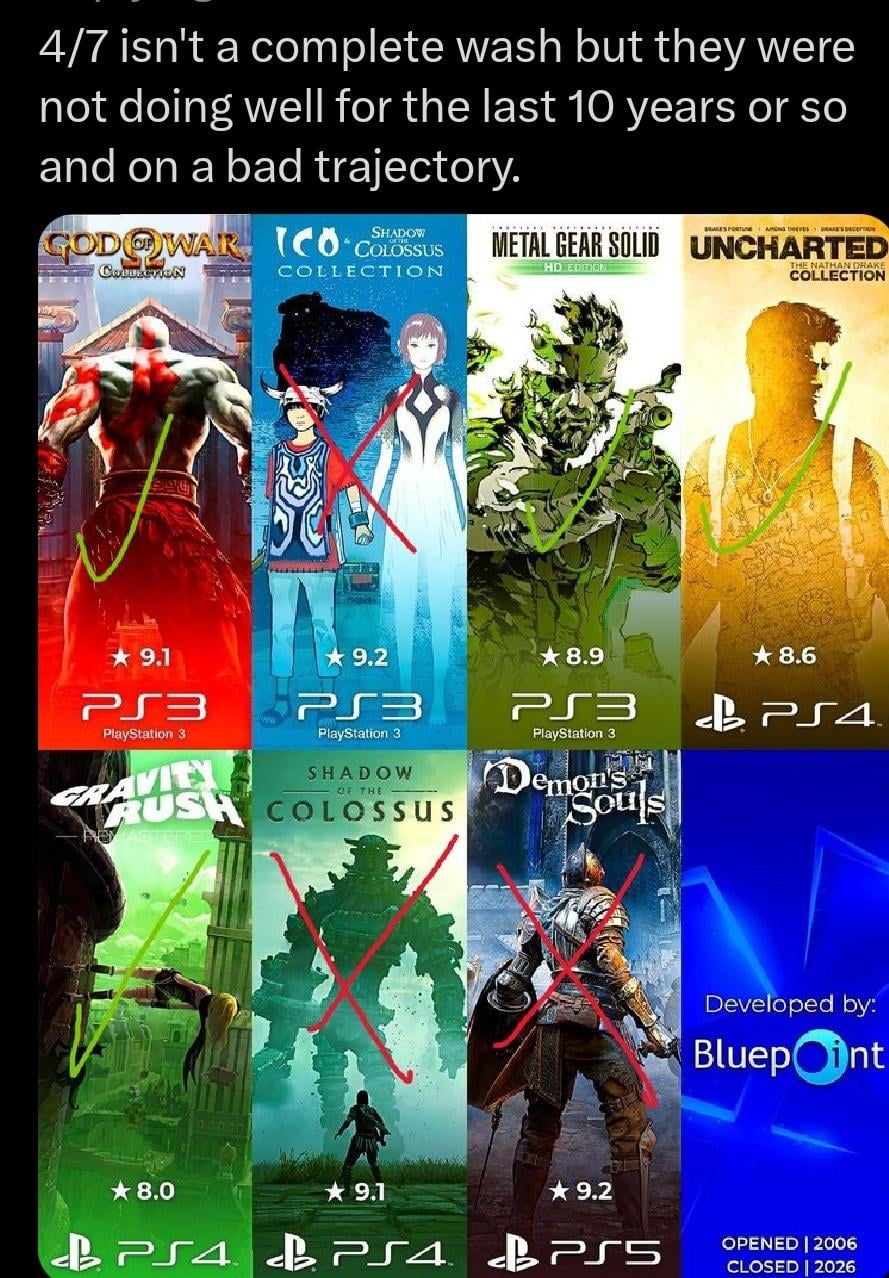 Demon souls, god of war, nathan drake, gravity rush, shadow of the colossus were all worth my time and money, rip bluepoint.