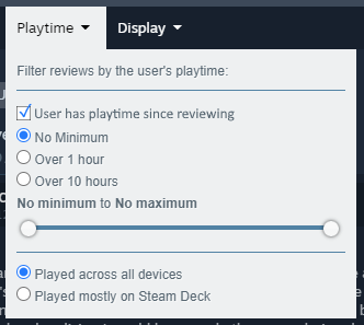 Because I've seen "amazing game" style reviews with 1 hour playtime and nothing since too often. Same for "absolutely terrible" with '4000 hours in game, 24 hours at time of review', etc. Just me? Posted by actuallyVile