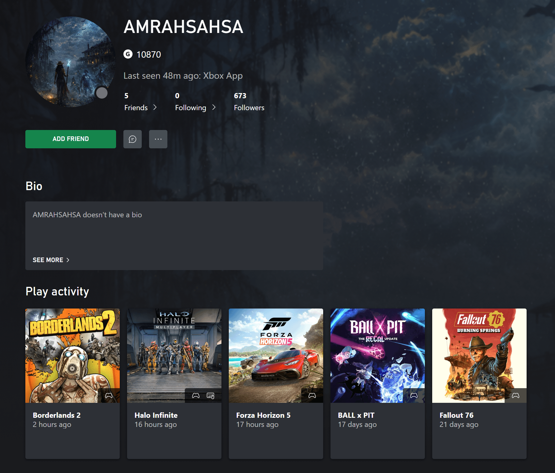 It says she’s got 10,870 gamer score, so she’s been playing for a while.