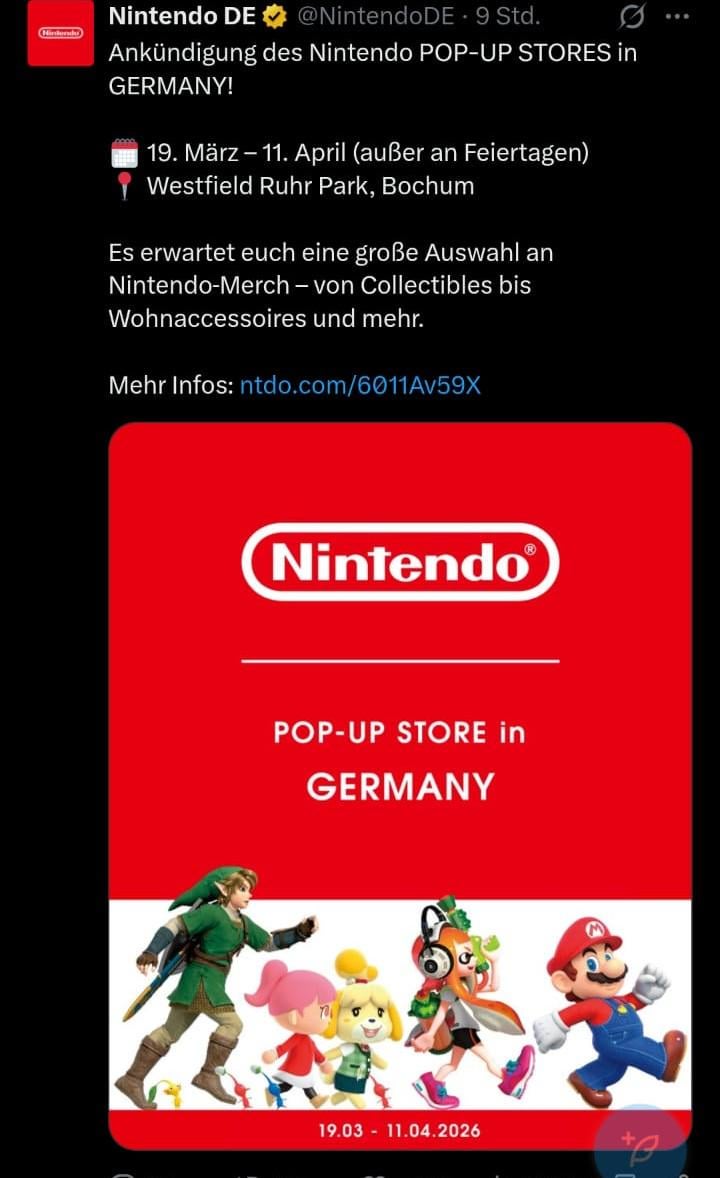 It will be open from March 19th to April 11th in the Ruhr Park in Bochum. Which is like the most random ass city for a Nintendo store lmao Posted by ViftieStuff