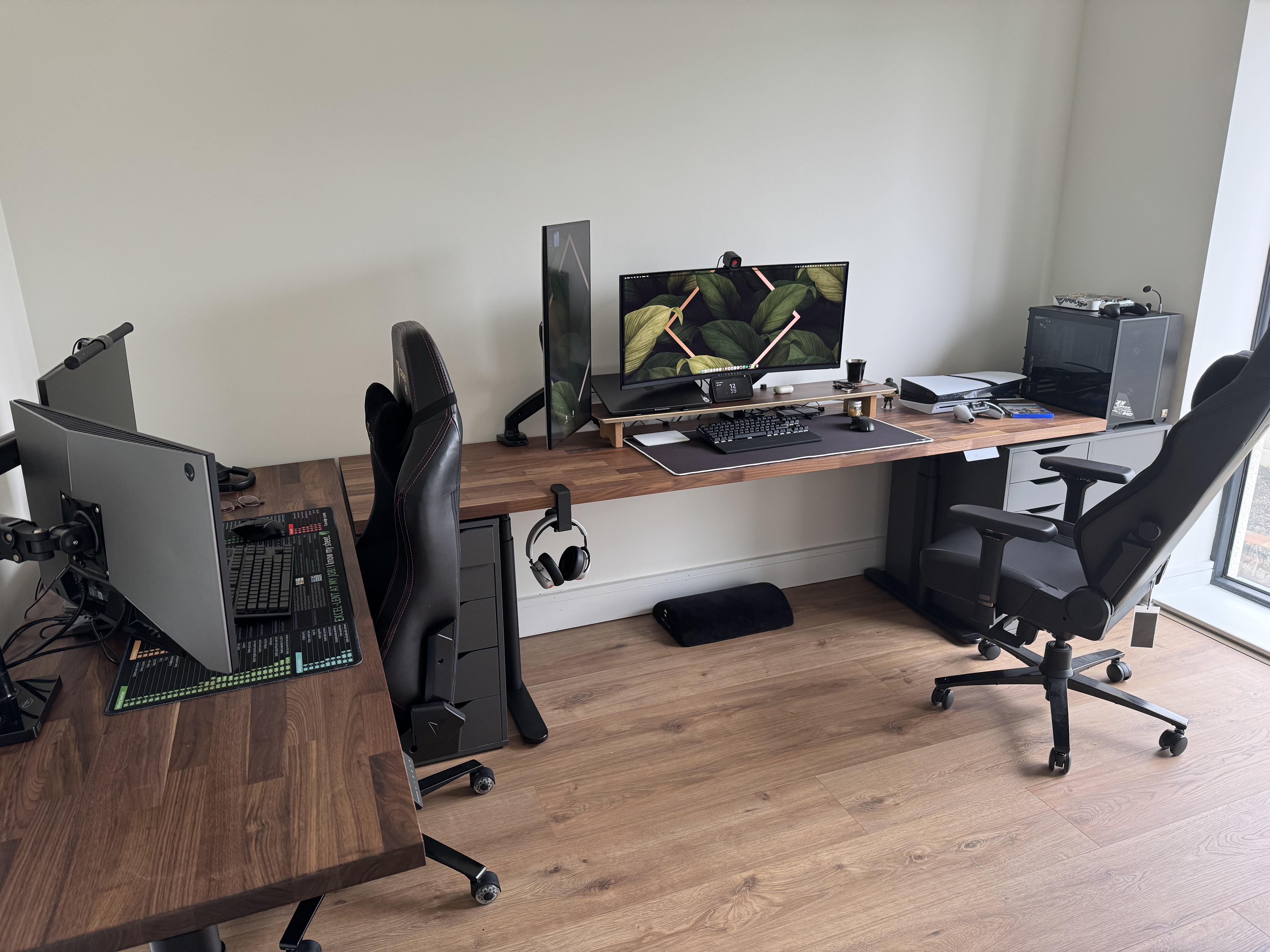 Still pretty much lifeless as we need to paint the walls and decorate a bit, but I’m looking for any advice or ideas on how to keep the setups cleaner and specially how I can improve the cable management under the desks.