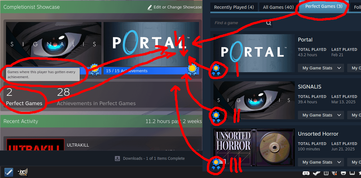 The completionist showcase should either say "n perfect games displayed" or just the actual amount that i have in my library. In my case it's not thaaaat bad because I haven't 100%-ed that many games yet but it's really subtly annoying and it doesn't seem like it would be that hard to fix…