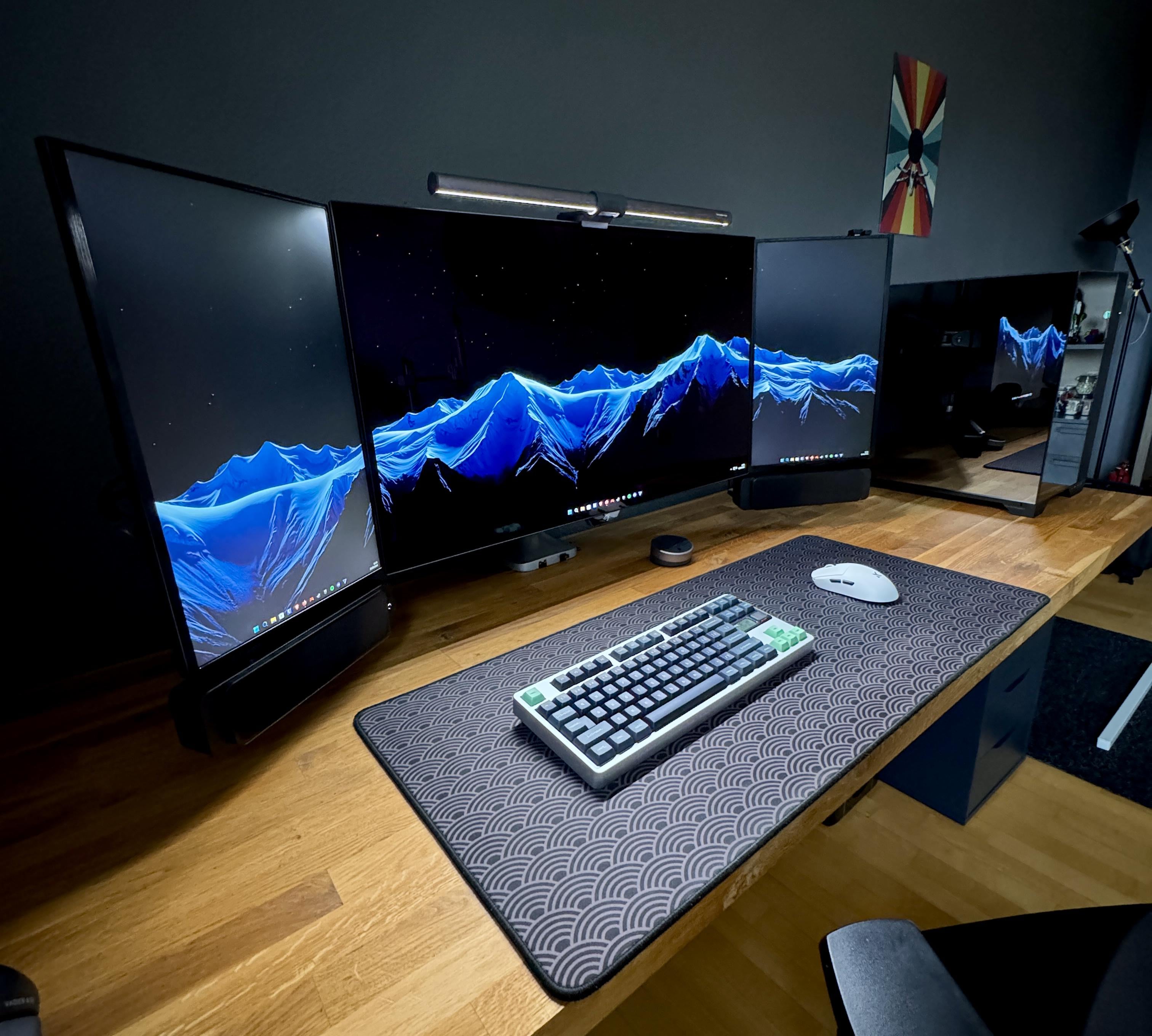 Couldn't wait until moving to another apartment later this year, so I had to redo my current setup. Cleaned up all the cable management and replaced my second monitor with these 2 18" UPERFECT screens. The blacklevels aren't as bad in reality. The middle one is a 32" OLED from ASUS.