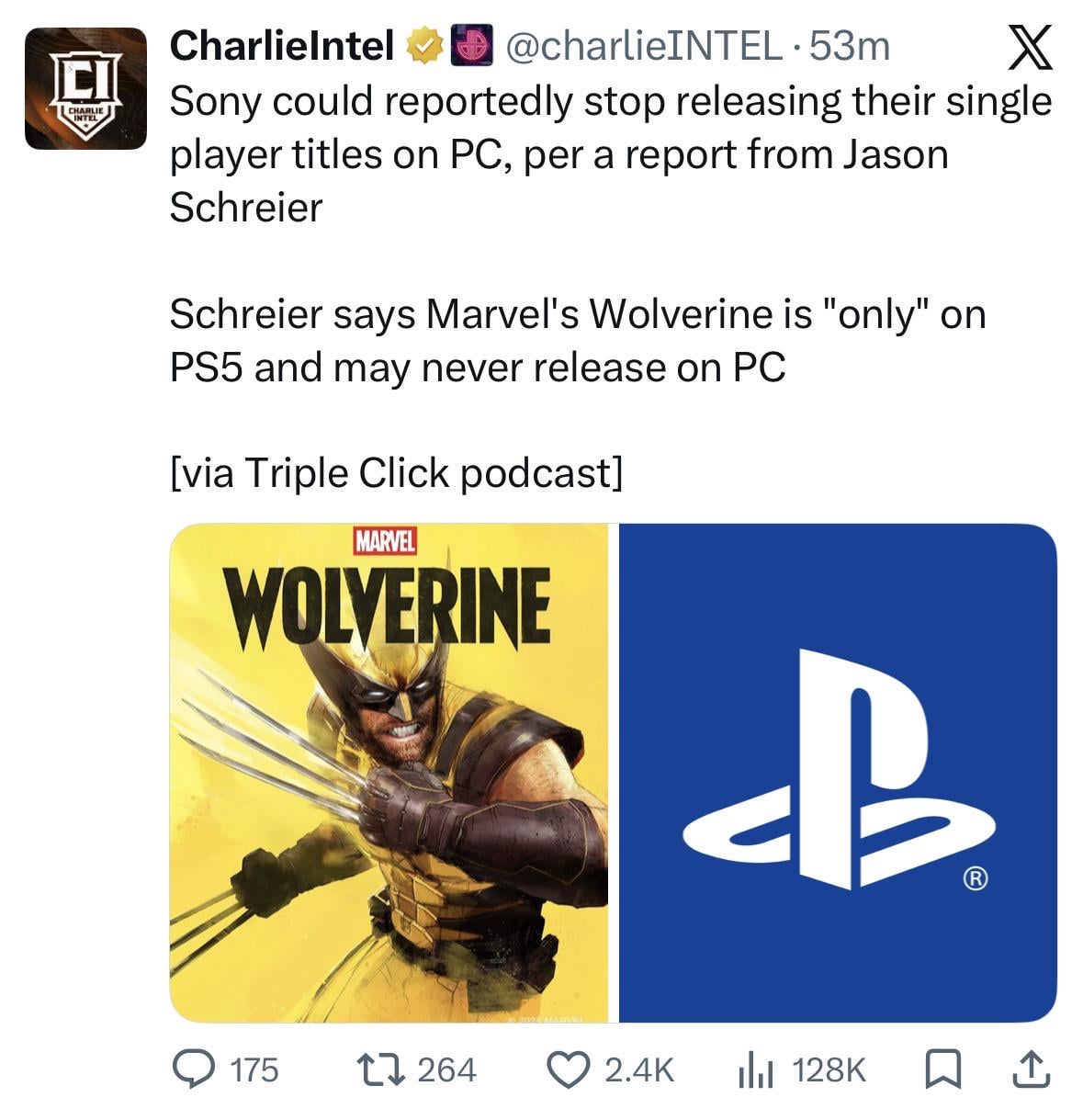 Jason Schreier Says PlayStation Is Withdrawing From PC With Single Player Games And Wolverine Will Likely Never Come To PC