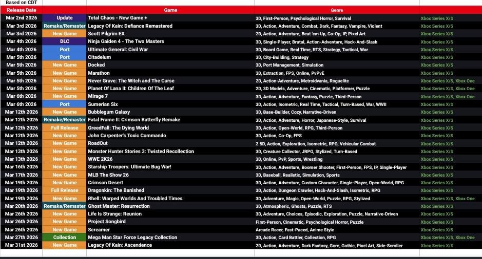 Forgot the links oops! Here's the list of games releasing march 2026. And Here's the link to the spreadsheet! Link: https://docs.google.com/spreadsheets/d/1EbGHsJjxt4VrpD8_0jPZn2JMB7WNz945S1hFgfXWddg/edit?usp=drivesdk Posted by Howerev