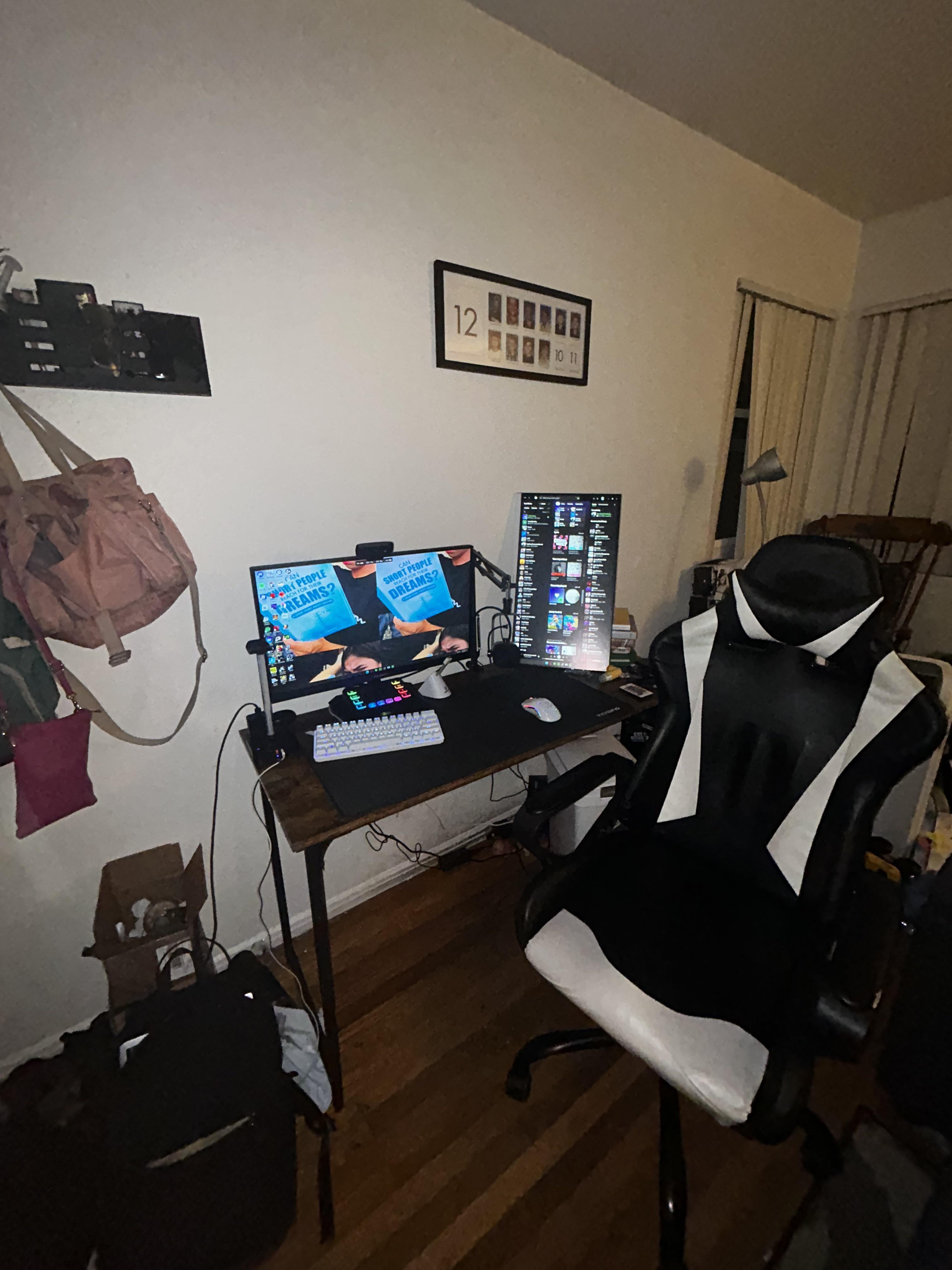 I’m in highschool and saved up from baby sitting and birthdays to get this, I got a 3060 and a ryzen 5 5600 in the pc, 1440p 240 hz main monitor and and 120 hz 1080p for the secondary! I kinda raw dogged the mounting of the second monitor, I put books behind it to prop it up and I layed thick tape infront for it to rest on