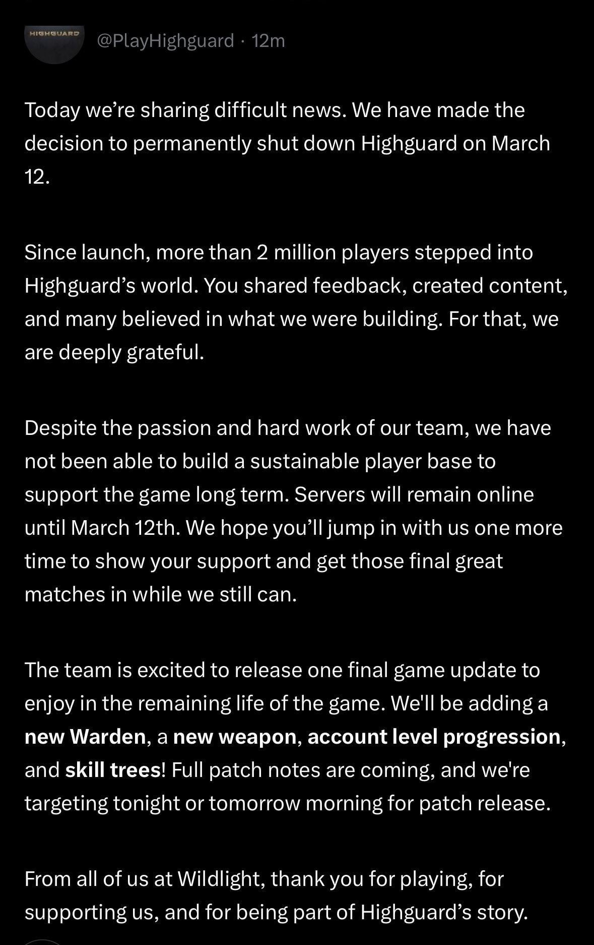 Why even drop the patch with new stuff to only shut down 8 days later? I know it is already made so they ar probably saying might as well release it….Account Level Progression, for a week.