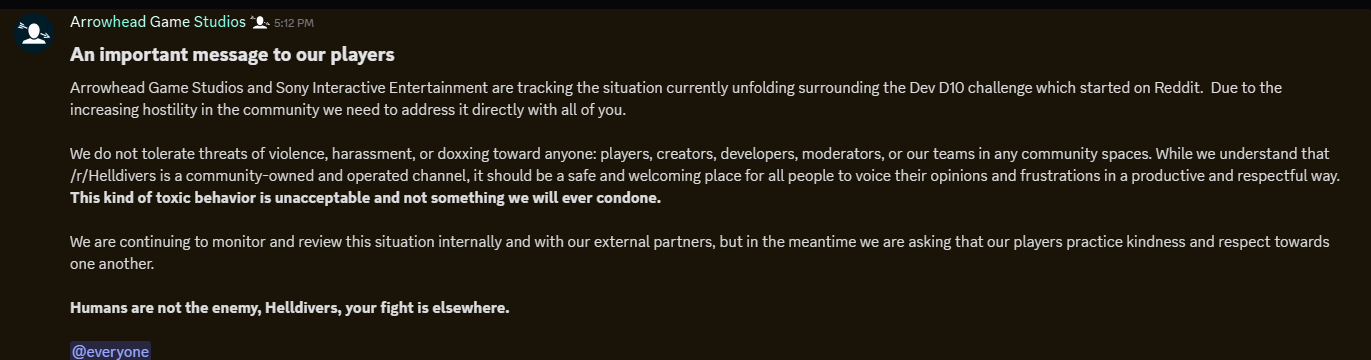 Helldivers 2 devs ask players to “practice kindness and respect towards one another” as devs receive hate over D10 challenge