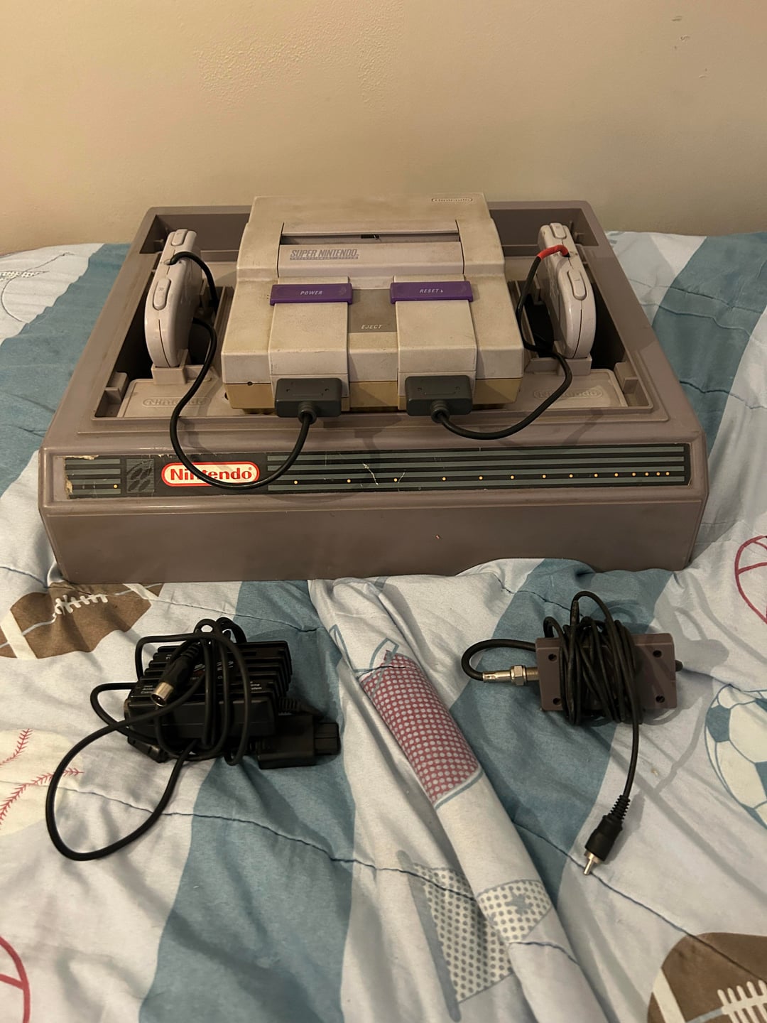 I am trying to help my mother sell her Super Nintendo Entertainment System. With the accessories and system itself in the varying conditions, I am personally unsure of a price but my guess is around $120. It has the console itself which has the cartridge cover stuck open, two controllers with one of them having heat shrink on it from me fixing broken wires, the Nintendo RF switch, the 3D2 converter box, and the Super Nintendo organizer stand with no lid. There's no power adapter for this system and we have no idea whether it turns on or not. Thanks