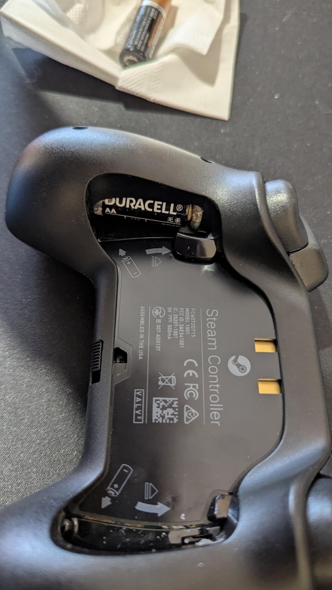 I decided to use my original Steam Controller today and noticed that the one of the back button did not click and the device did not turn on (I remembered there were still AA batteries inside).