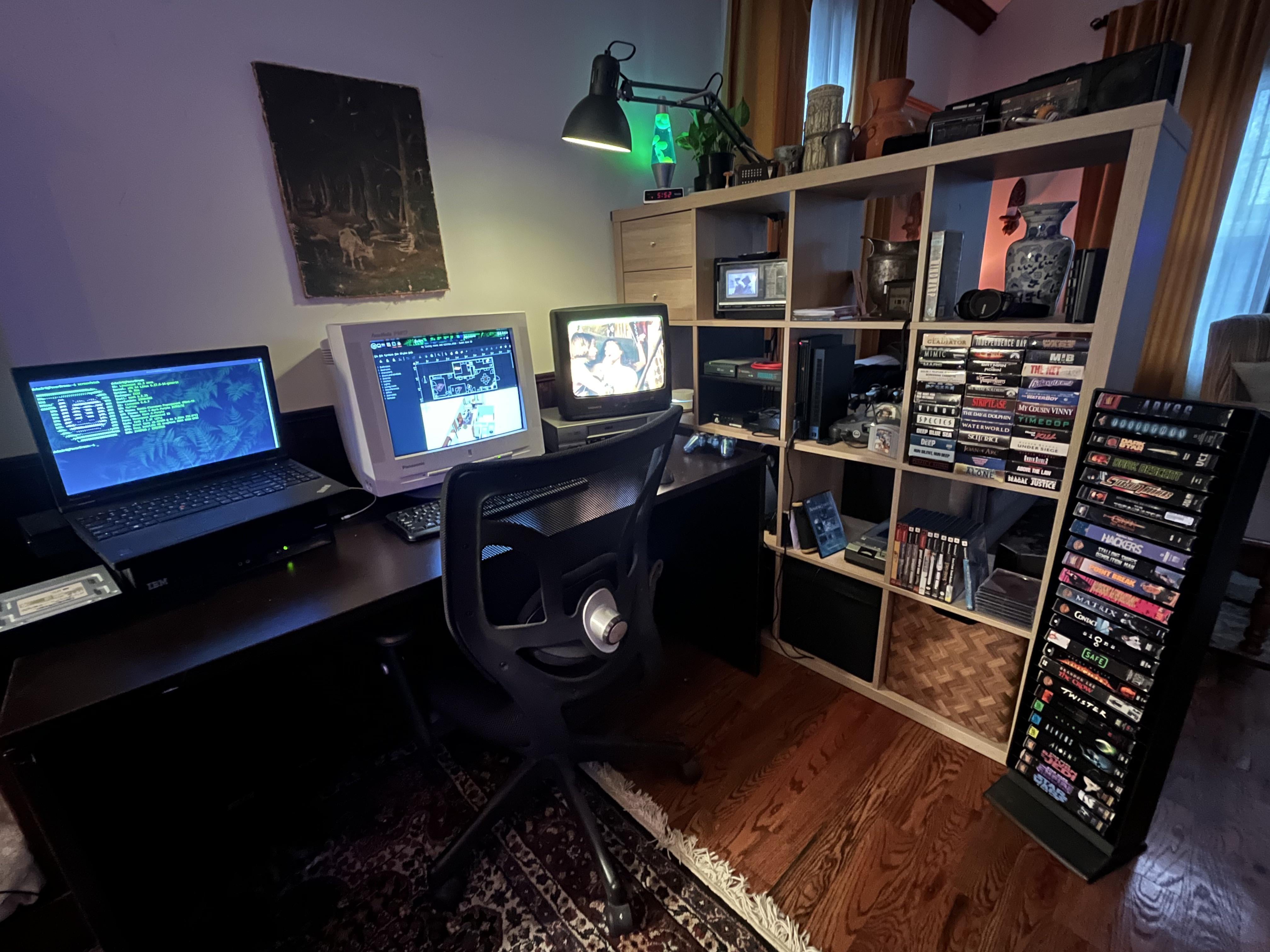I recently finished setting up this battlestation with an old IBM thinkcentre running windows 98 and a Lenovo thinkpad running mint. Both sharing my Panasonic pm17 crt monitor, and mouse and keyboard through a KVM switch. I also have a magnavox crt tv with a VCR, N64, and PS2 all running through a composite switch. Oh yeah there’s a RadioShack portable TV with a digital tv antenna hooked up.