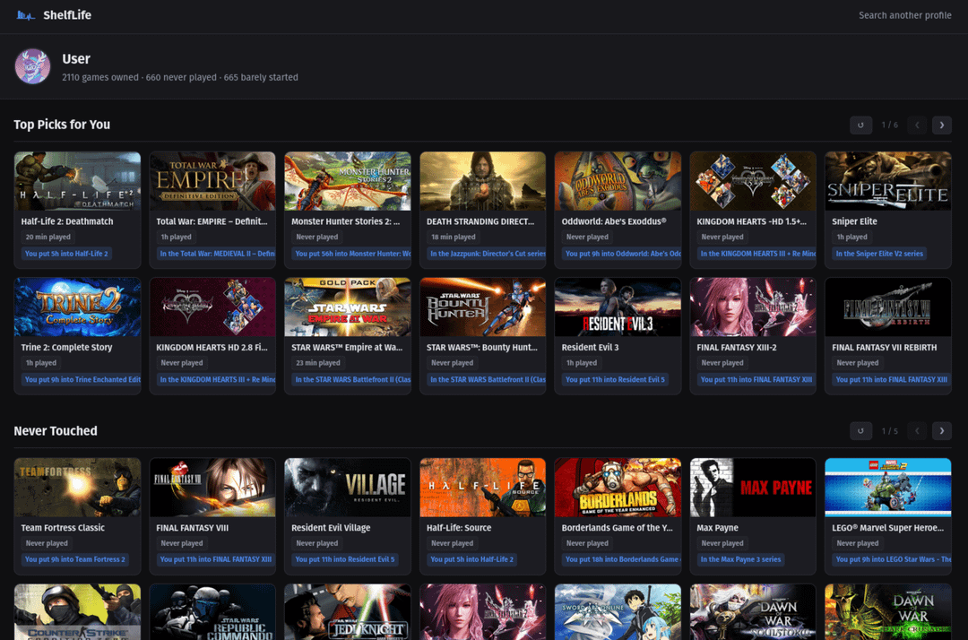 I have a very large Steam library (2,000+ games). For as long as I can remember, I’ve wanted a tool that could look at my Steam history and recommend which game in my own library I should play next. I searched for something like this for years but never found anything that really did what I wanted.