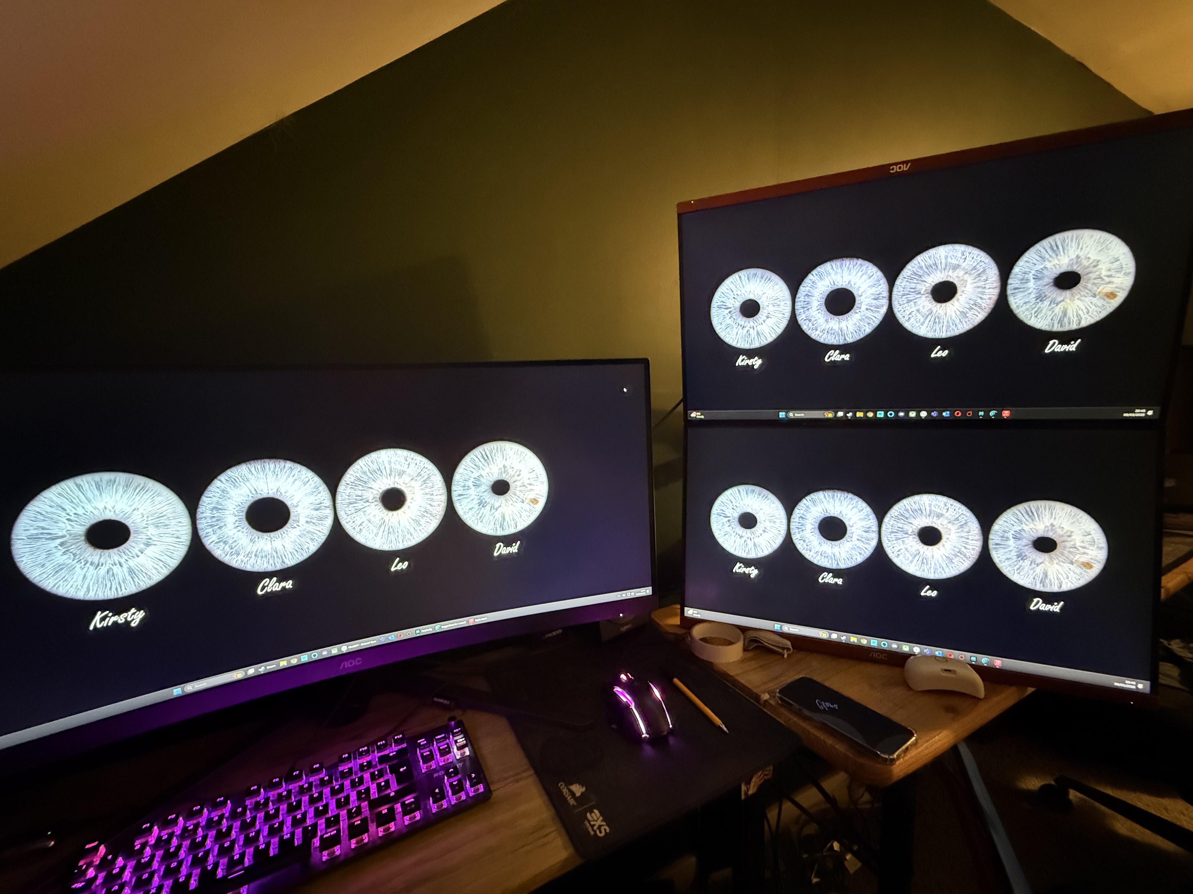 The monitors are a curved 34” ultrawide, and 2 27” FHD monitors.