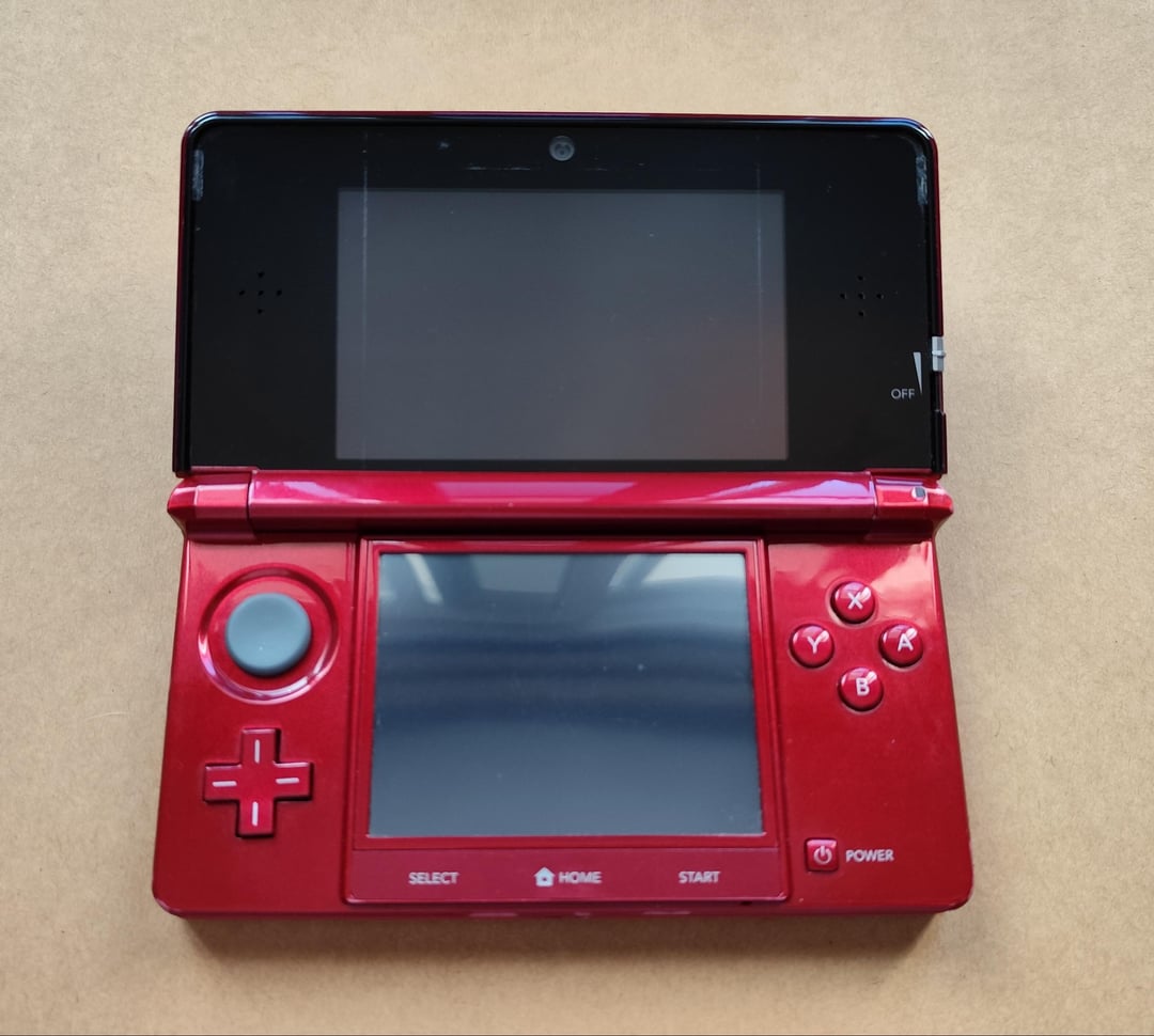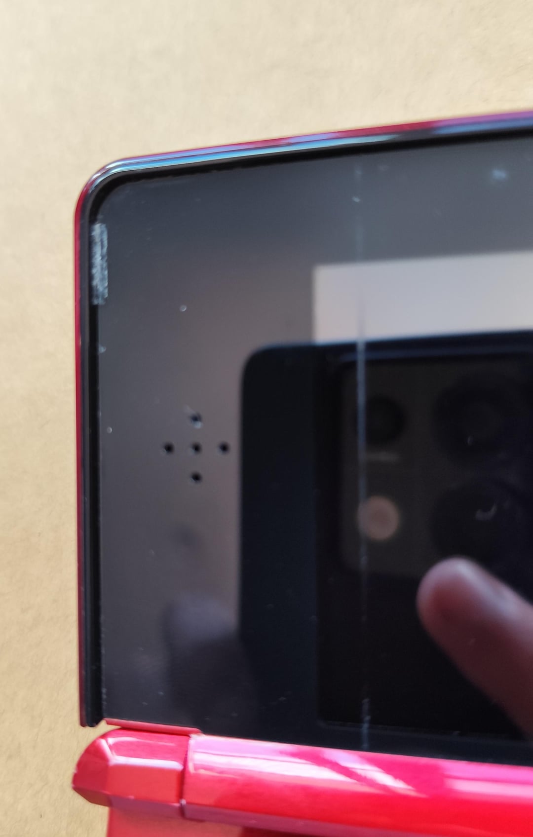 After years of looking, I found an old 3ds in good condition for a reasonable price, as you can see there's an imprint of the lower screen on the top lens, caused by the upper screen legs.