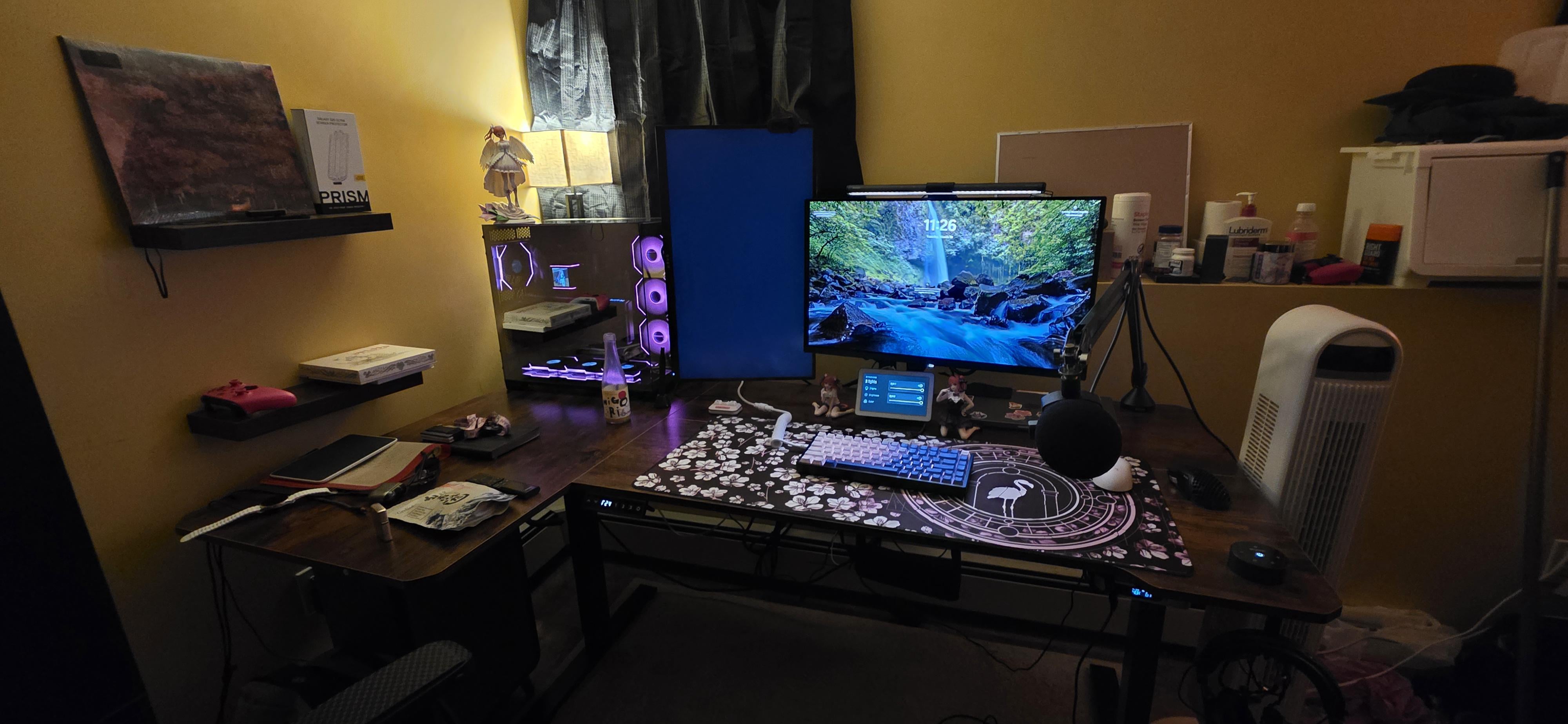 Just got the desk today, the main monitor is an oled, im not looking to update my hardware so much as my general desk space there are two shelves the the left and a book shelf behind me when I sit at the desk but I feel like its still missing something…