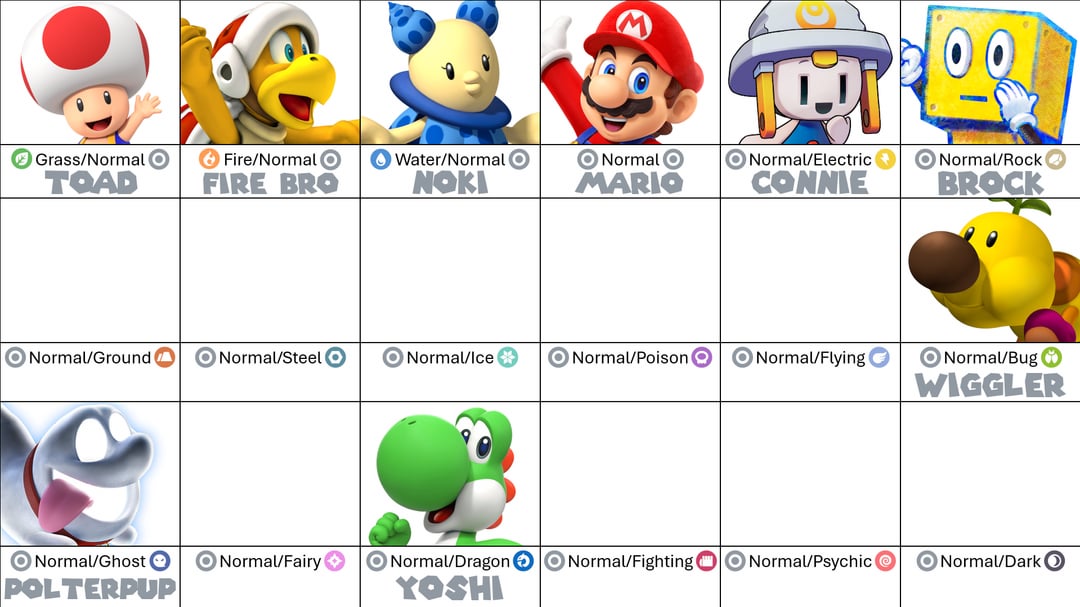 REMINDER: While I'm allowing multiple variants of the same species, I encourage everyone to try to be as unique with your choices as you can. Mario has a large character roaster, and I would love for this chart to represent that in some capacity.