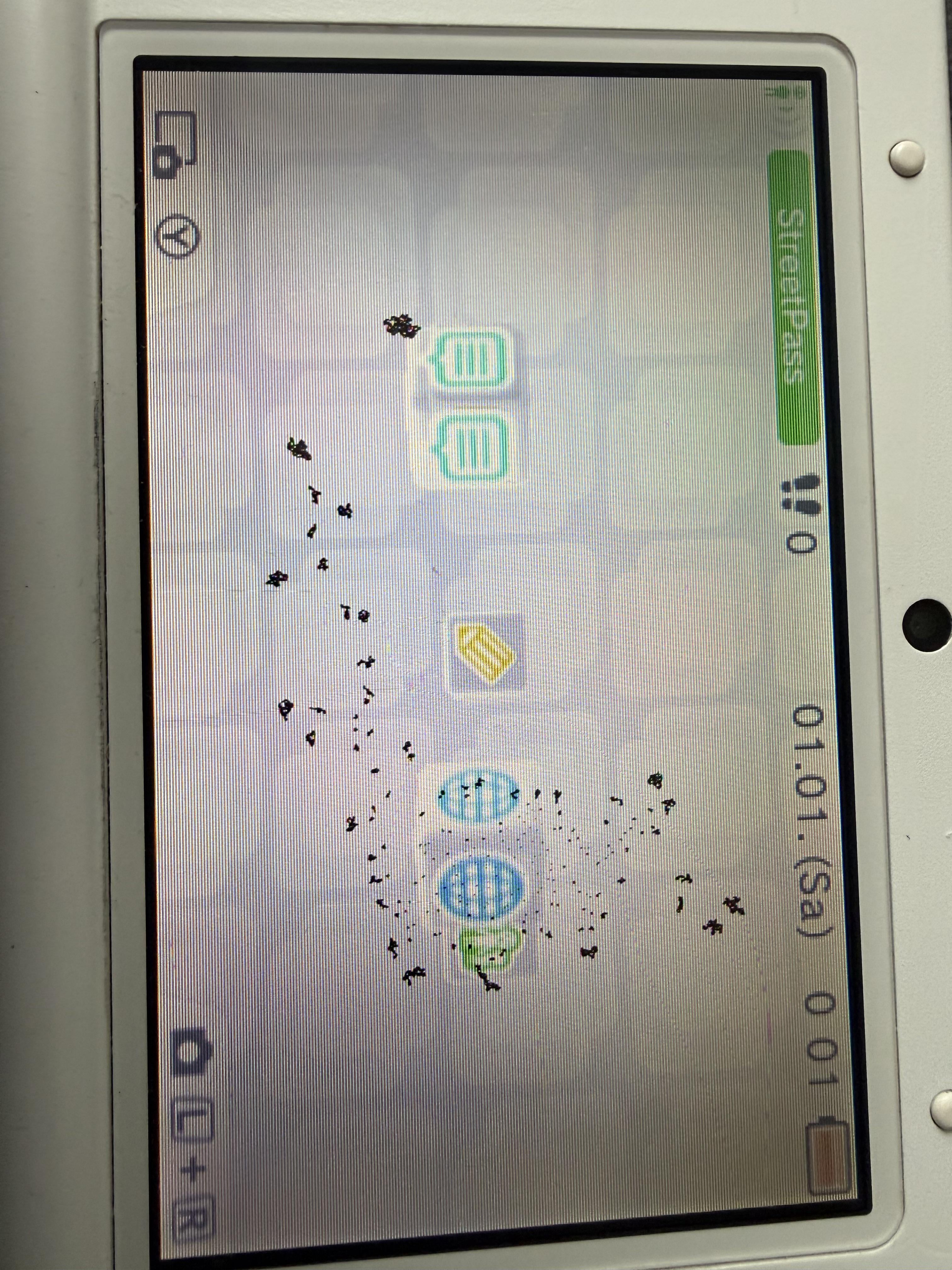 Bought this (fully functional) with (zero) scratches 3ds xl on a Plattform that sells second hand stuff for 160€. The seller send the device in a vacuumed plastic bag in a taped envelope. The website offers refunds/returns for false descriptions and false packaging. Before I return this garbage to the seller, can anybody tell me what those black things are? When the device is turned off they are orange.