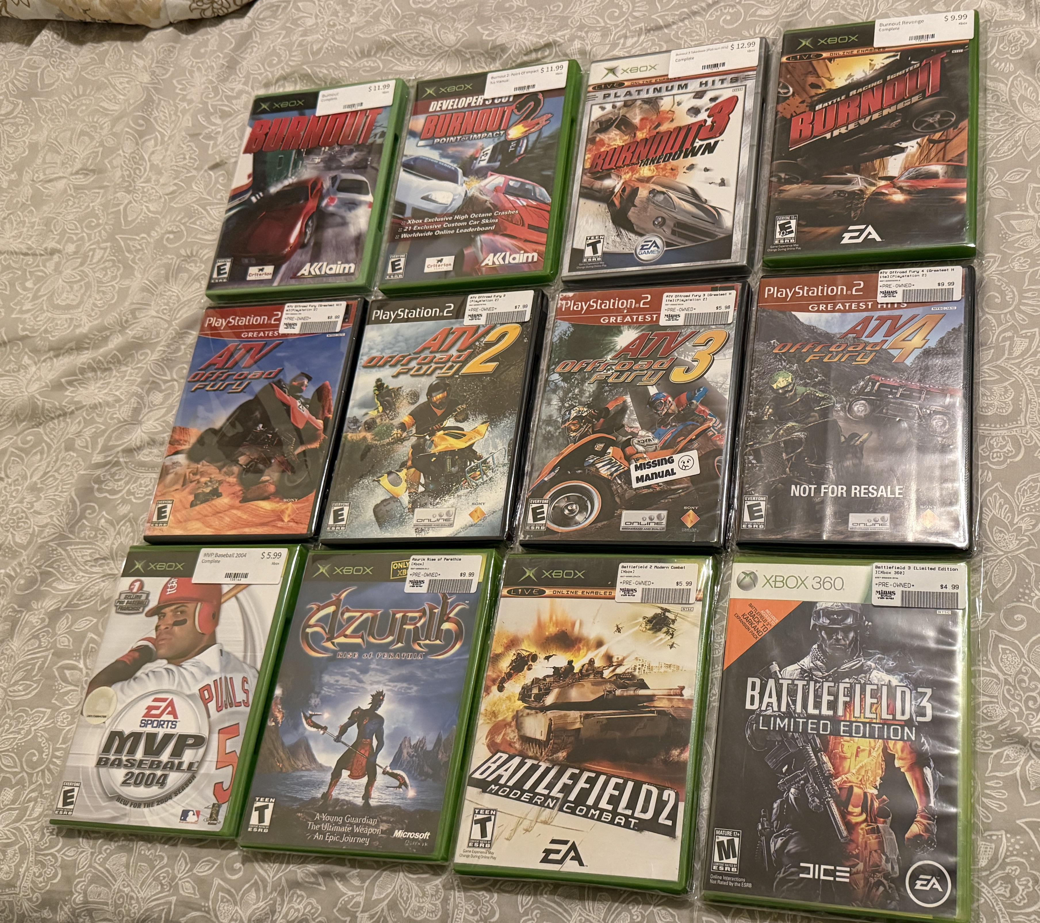 I found the Burnout and ATV Offroad Fury games all together and in near mint condition! Azurik came bundled with my OG Xbox when I bought it, so it holds a core memory for me, and MVPB2004 was something I played hundreds of hours of while deployed in Korea. BF2 and BF3 just because they're goated (I already have BF4).