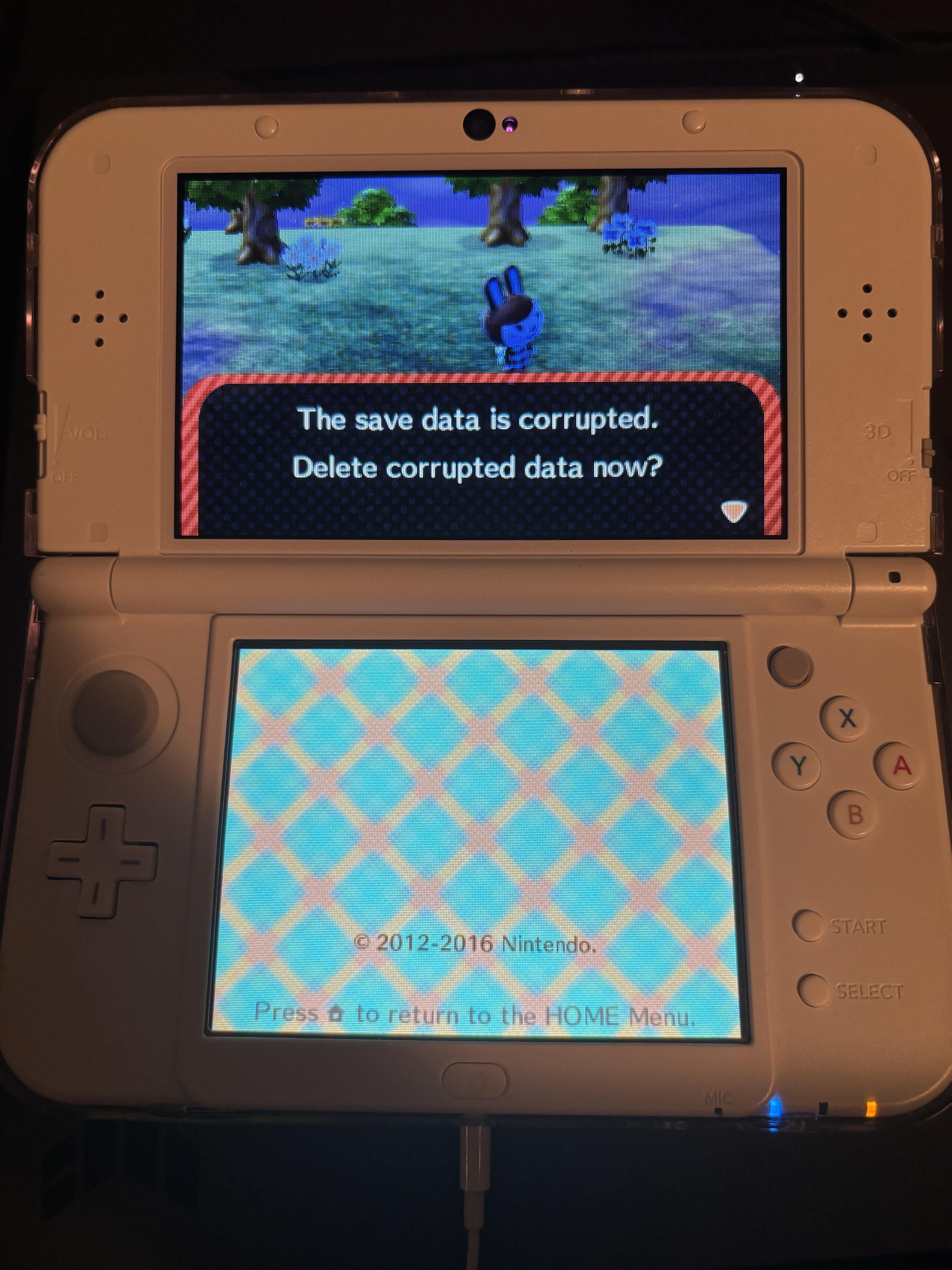 My battery randomly died last week so I had to order a new one, when I finally booted it back up animal crossing had corrupted. Guess I’ll be restarting my world. Posted by Lasagna24