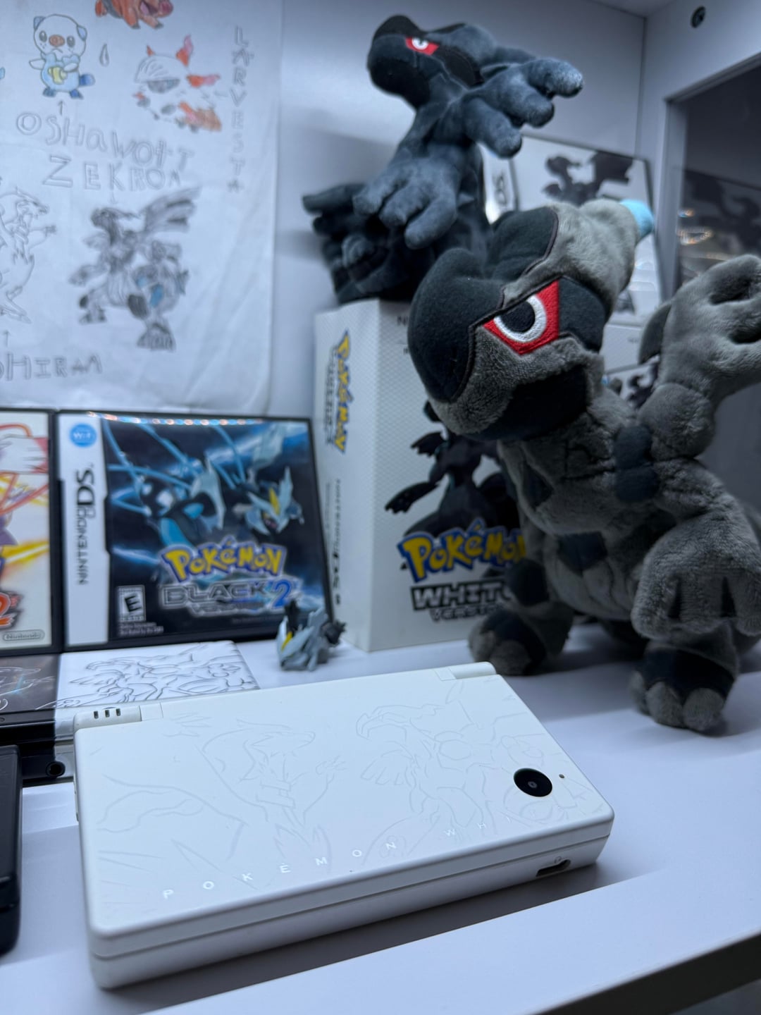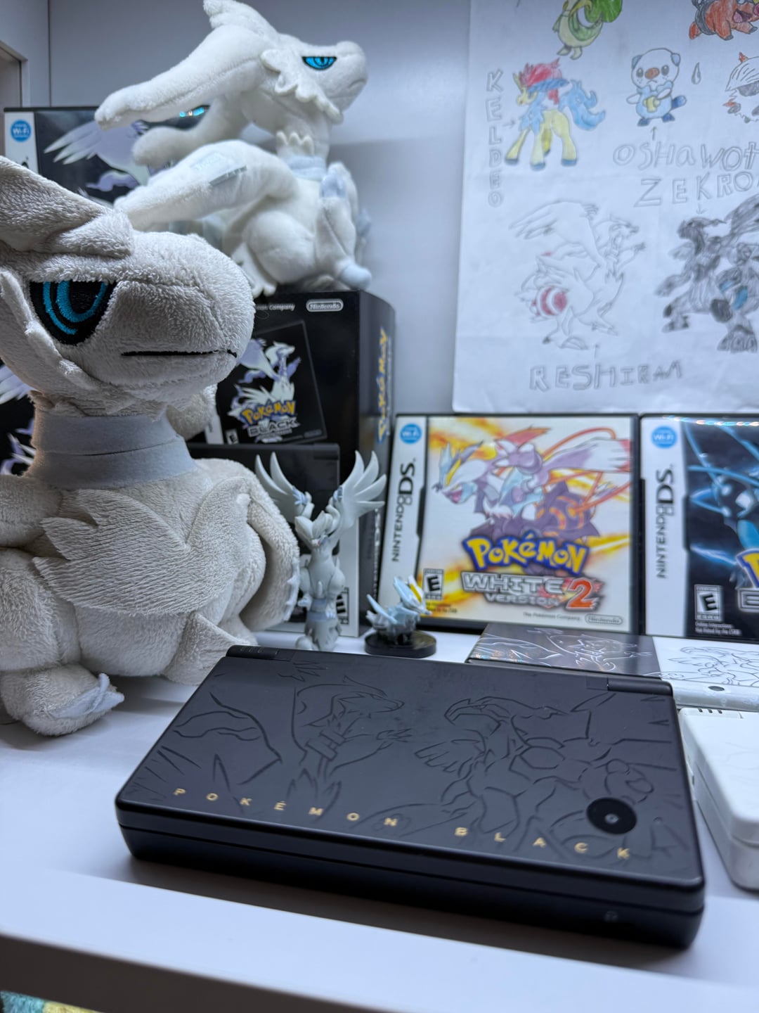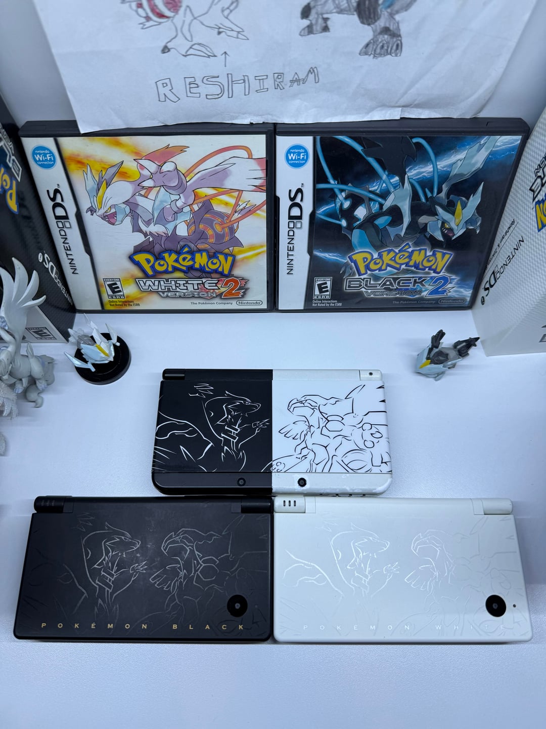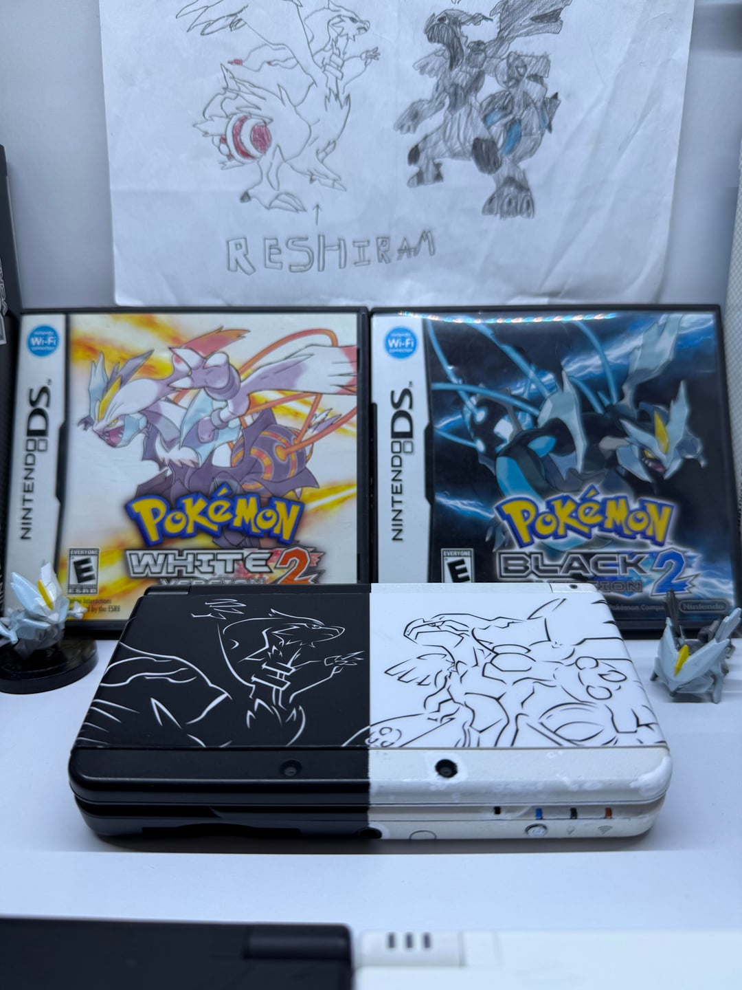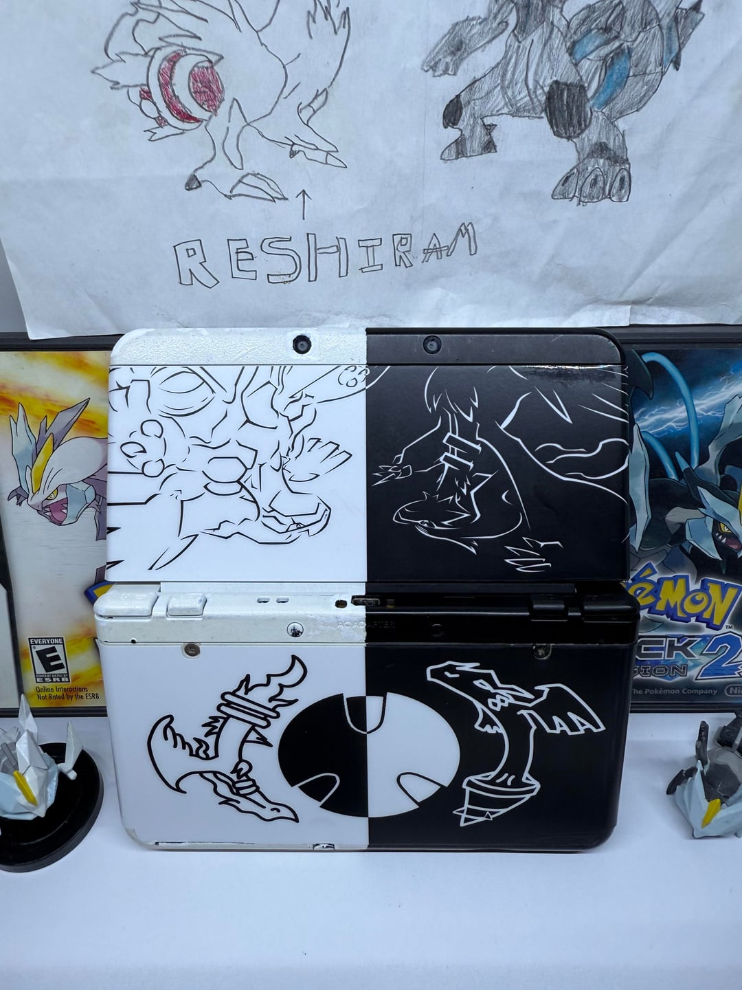 i made this custom Black and White new 3ds last year, based off my favorite pokemon edition Dsi, and with the White Dsi arriving today i can finally show it off to the world! the faceplates were custom designed by me, retracing the original pattern tediously in illustrator. Custom clear/white buttons using fabbed ExtremeRate switch buttons, and a black joystick. the paints not as perfect as i want especially around the harder parts where the lights or speakers are but it’s good enough for me for now, thanks for viewing my latest passion project 🙂