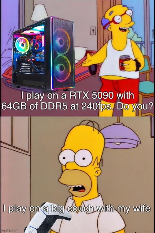 spoidercide on March 18, 2026 1:55 am I play on a small couch with my girlfriend on my 9070xt 4k 120fps 32gb ram I’m riding the perfect middle ground here