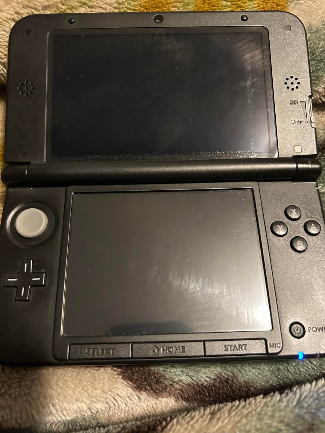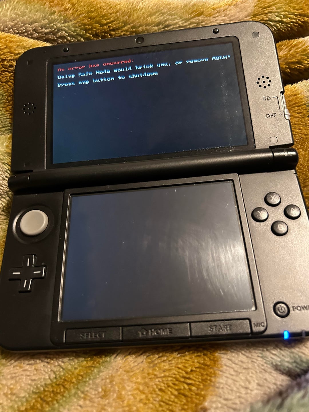 3ds was working fine previously and was modded with luma. however, upon installing software update to connect to internet, only the blue light turns on. the screen on top and bottom both flash on for a second before flashing off again.