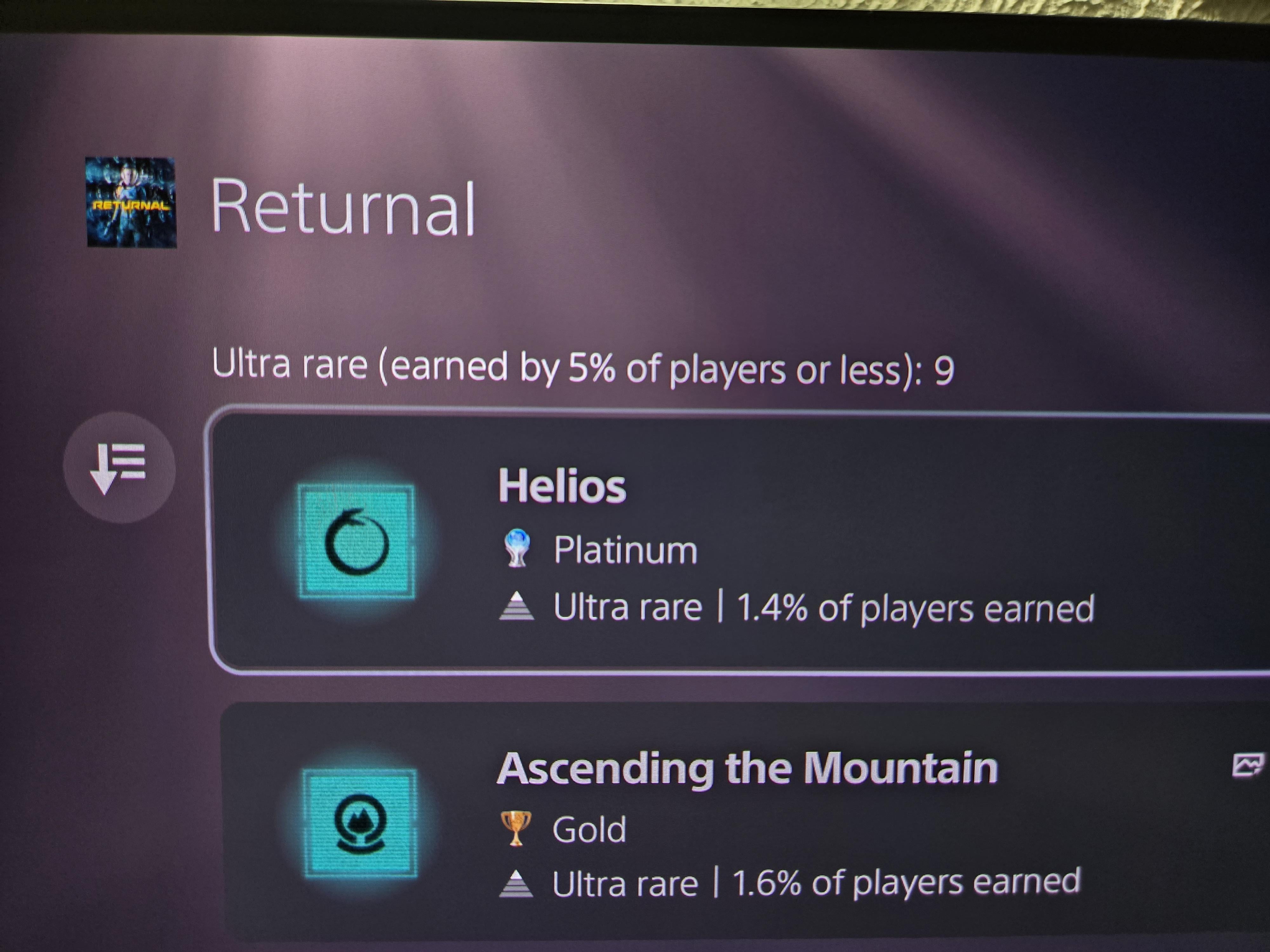 It can be either one that took a really long time or is very rare among players. Mine is definitely Returnal at 1.4%. Loved the game, can't wait for Saros! Posted by Jonners_90