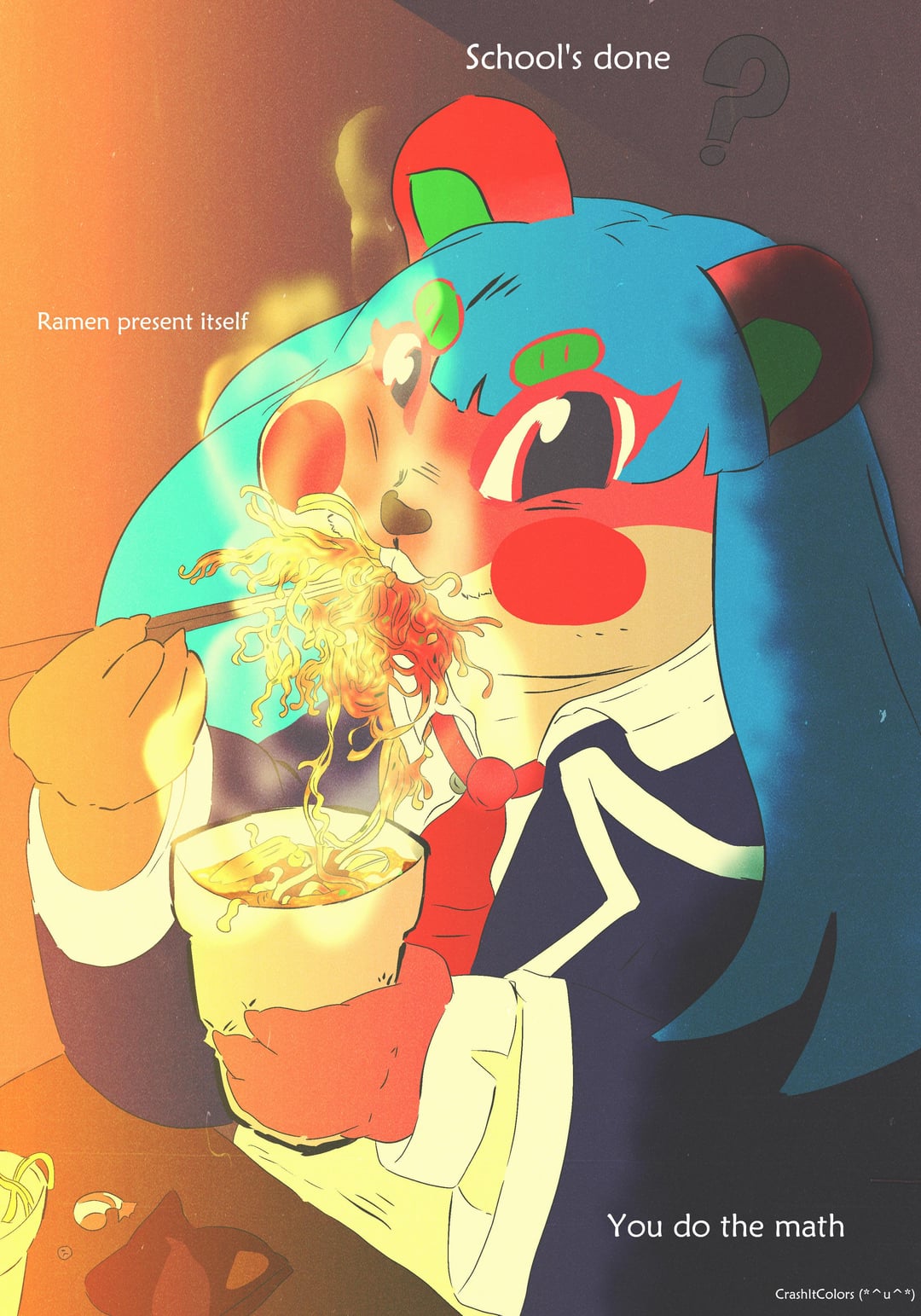 Heyo :3. Apple's enjoying some ramen after school. I decided to go with this outfit since it was too cute to pass up; plus, she wears it to the academy in the game, so it actually is something she'd wear. In addition, I gave her some blue hime hair because why not. Anyways, hopefully you can enjoy some good food today. I myself am probably gonna eat some cookies later :3.