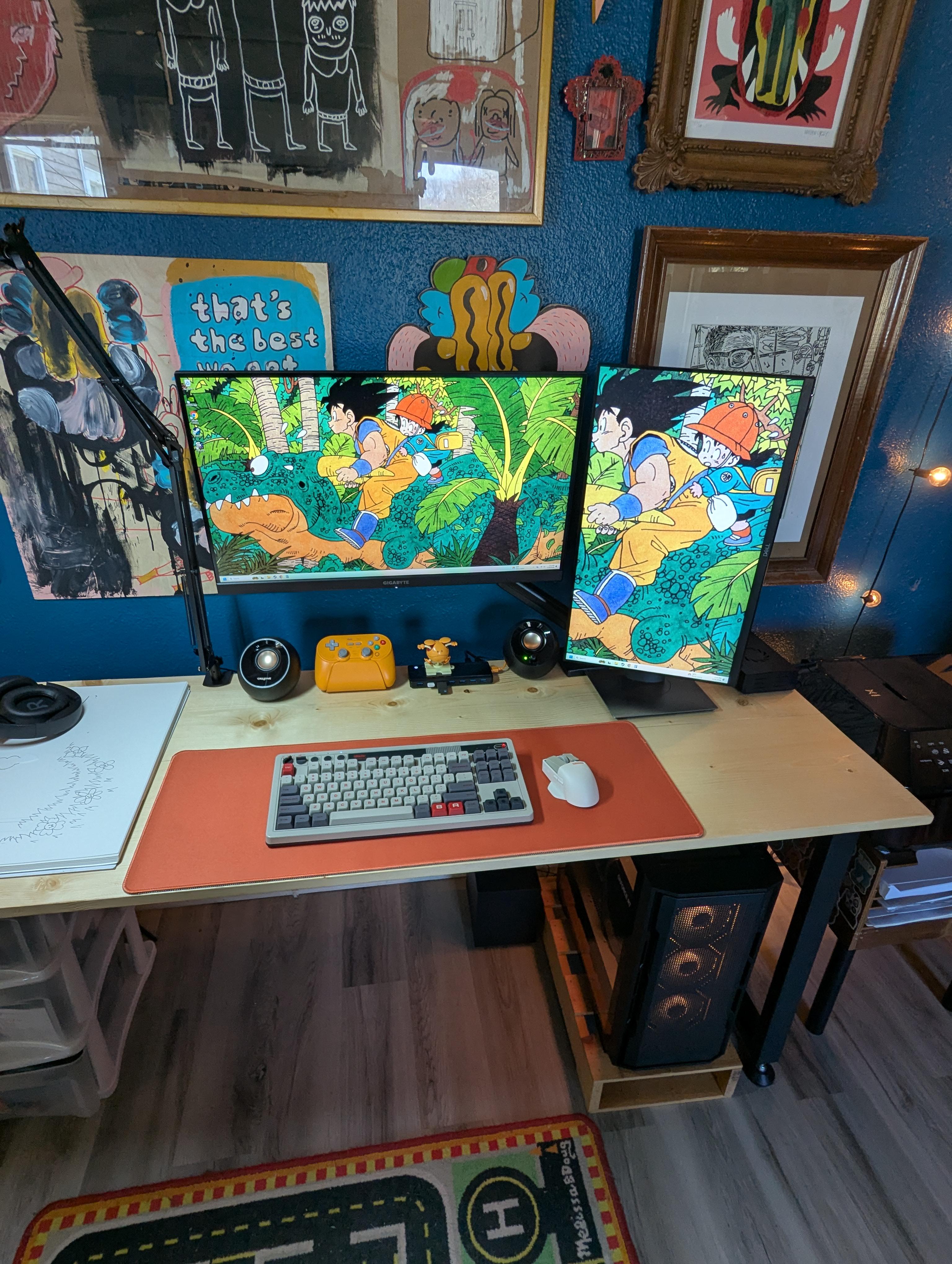 I went from a laptop on a folding table to this with a desk I built. It ain’t fancy but I’m really happy with it Posted by toasty_tuna