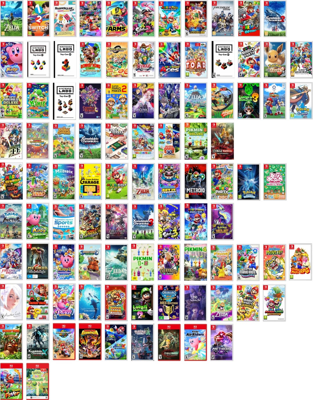 If you think there's a game missing, or one that shouldn't be on this list or if the order of the dates aren't correct, let me know. Part Time UFO and the Bayonetta games aren't Nintendo IP. I am only inlcuding one version of each Pokémon Game. DIcs/Expansions don't count. Service games like F-Zero 99 don't count. Nintendo Switch 2 Editions aren't included. Each row represents a year. All rows are ordered by date.