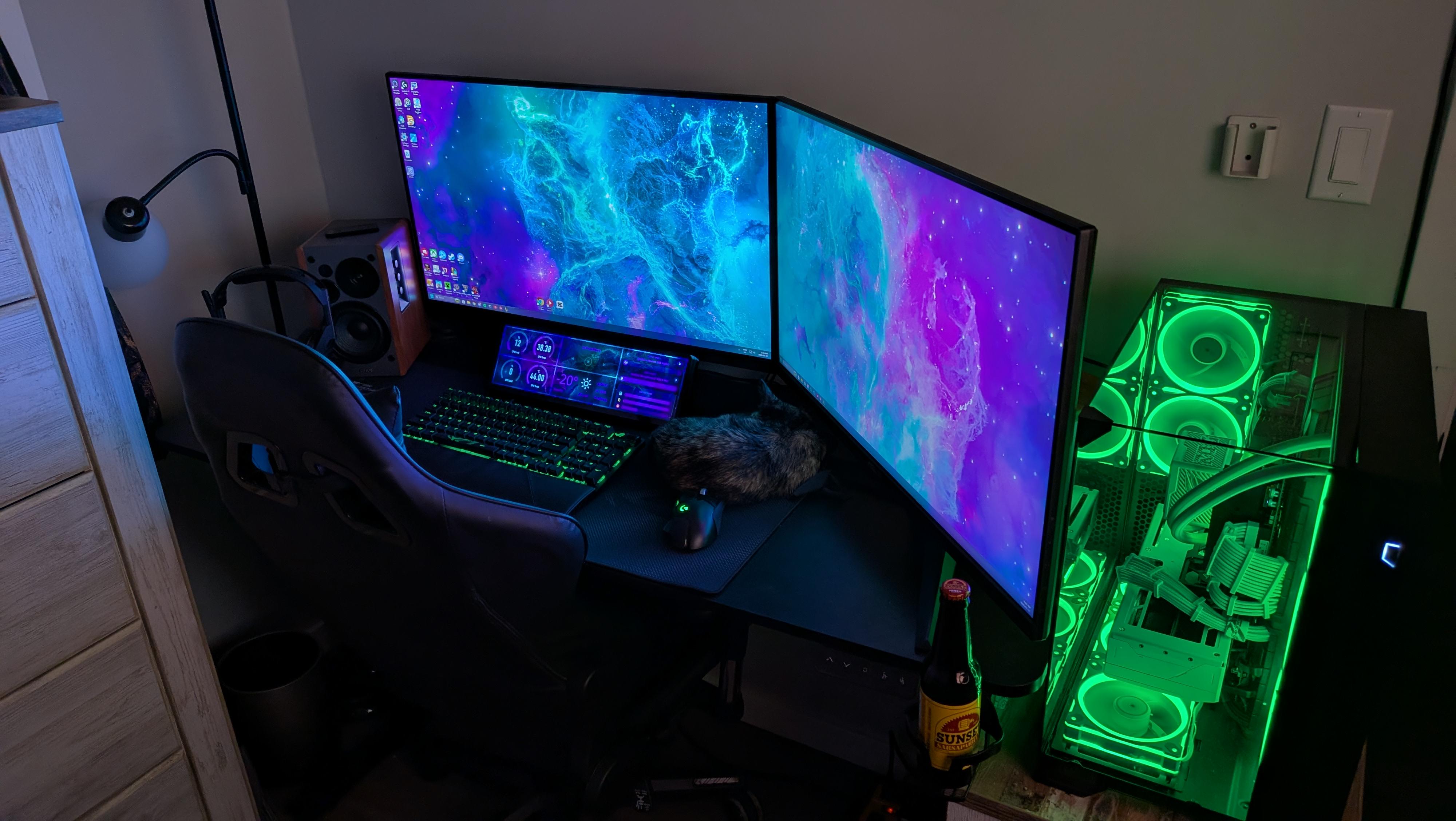 My room is small, I've managed to cram way too much stuff in a small area, I will eventually be moving everything to the living room and building it out into a game room, but this is plenty for now. definitely lacking in the decorations department. Bonus kitty sleeping on the desk pad for everyone's entertainment.