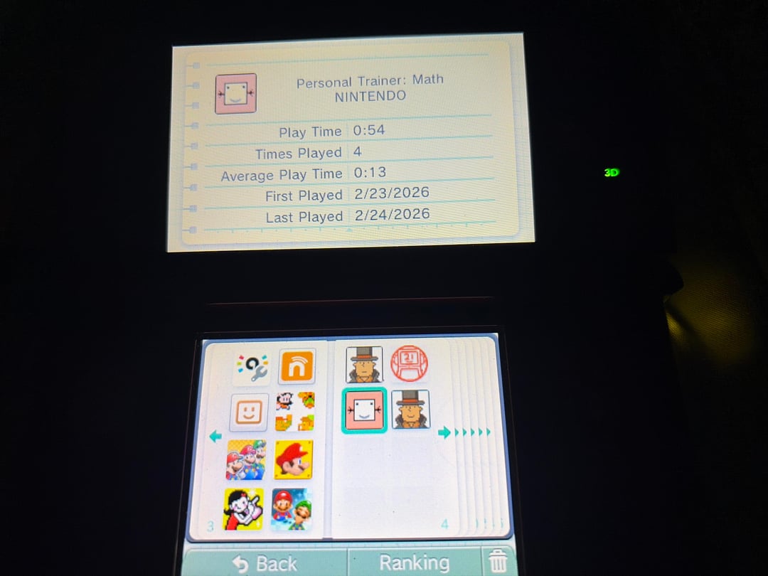 I got a copy of Personal Trainer: Math recently and put it in my 3DS, it showed no icon, title, or publisher. I was too much of a coward to try booting it up, so I returned it to the seller and bought a different copy. When it arrived, I put it in to find the same phenomenon occurred. I, confused, decided that this probably wasn’t a coincidence, so I booted up the game, and it worked just fine. I boot it up more times, and it still works, although it’s still not showing anything. Today I open the activity log, where I jokingly get excited to see the blank icon, only to look over and find that the icon shows up, I flip over to the page that has it in the activity log, to see that the name and publisher are both there. Why is this happening?