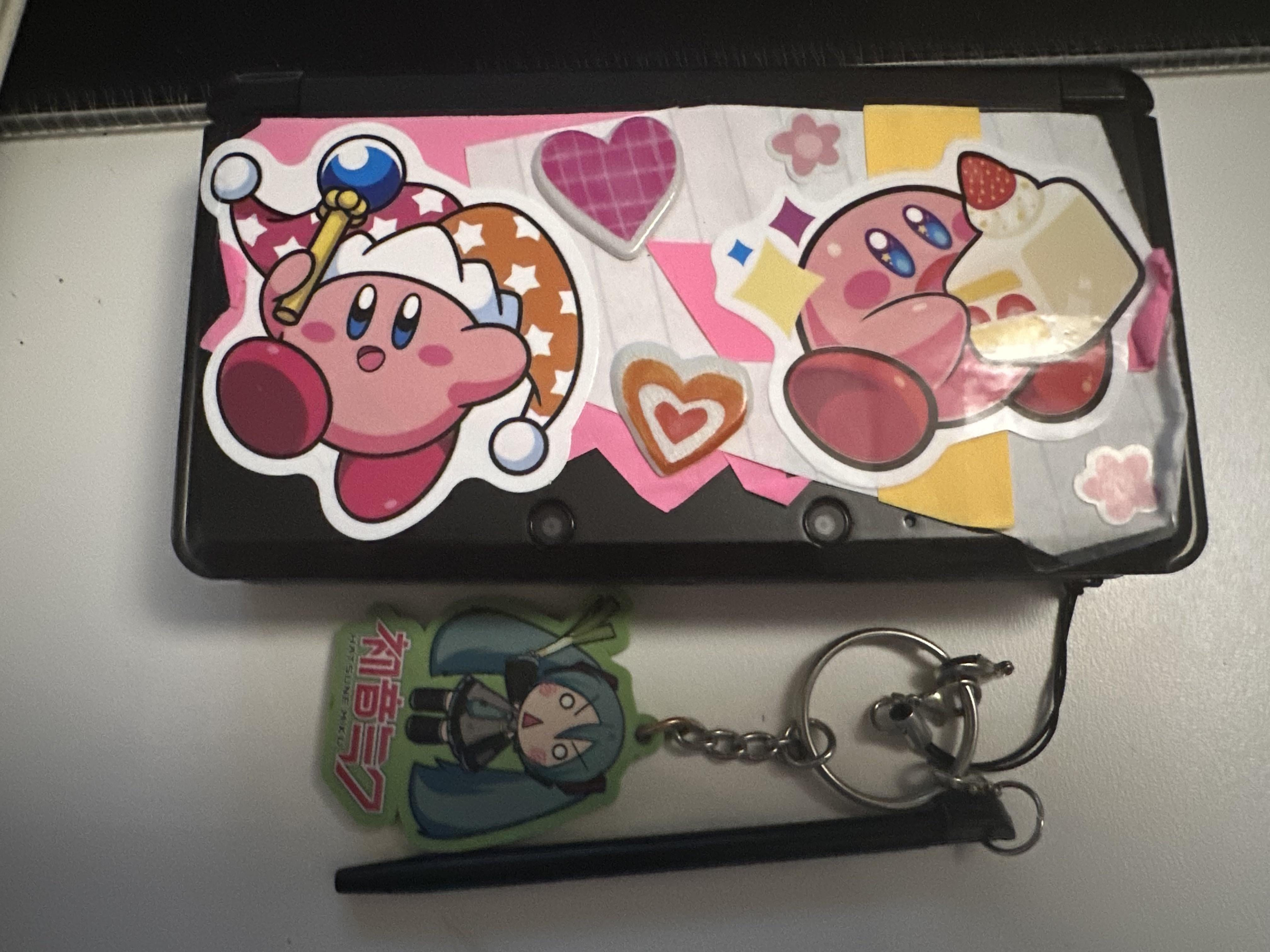 i was starting to get bored so i decided to decorate my 3ds with the limited stuff i had. it’s just compiled of paper and stickers i found. i also attached a miku keychain and a stylus that i stole from my wiiu gamepad. this’ll prob leave some residue but whatever 😭