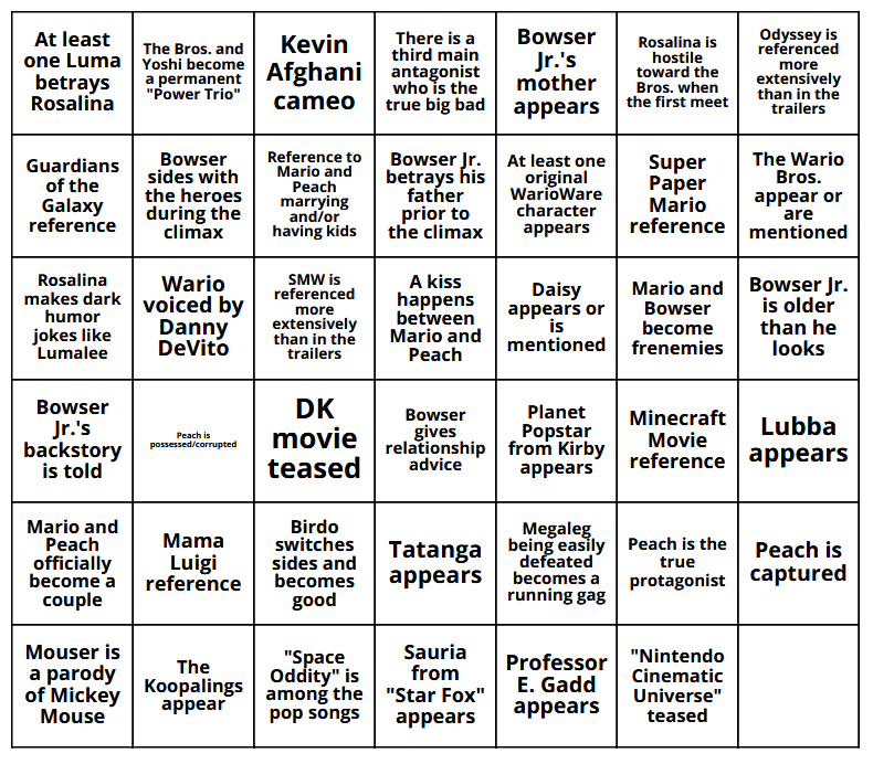 Just created my own Bingo Card for The Super Mario Galaxy Movie. I actually generated 30 different cards, but they all are random combinations of the below options. I will follow up once I see the movie.