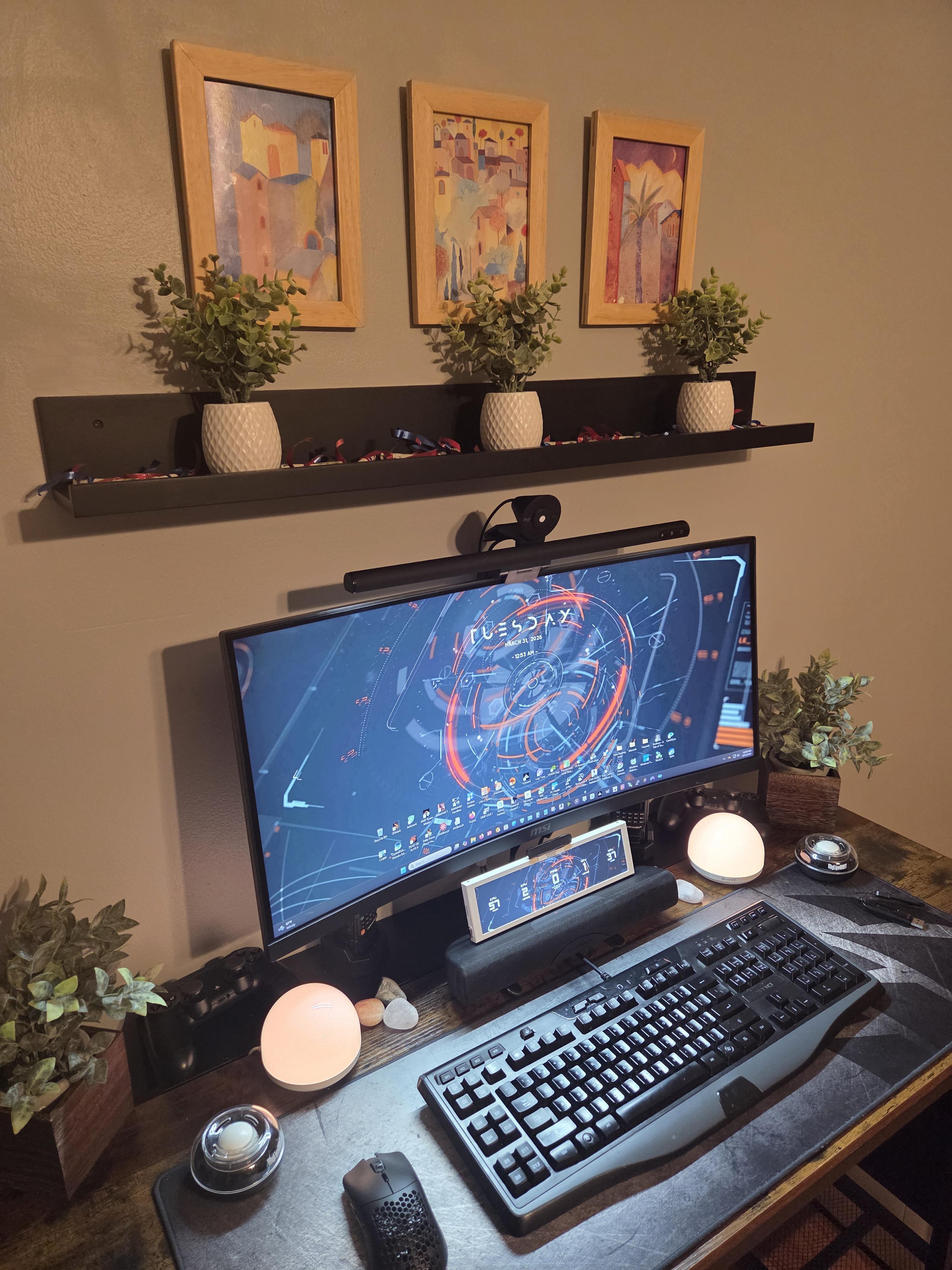 Got a new desk from Amazon over a week ago. A bit small (47" x 16"), but I decided to keep it, as I can no longer cancel the order & it was on sale for about $40. Added a shelf at the back & mount the monitor on the wall to expand the width. Still needs extra lighting, framed decor on both sides & some wood paneling. I'm also going to replace the keyboard (maybe white color), as it's showing some signs of aging. It's OK for now, I think. What do you think?