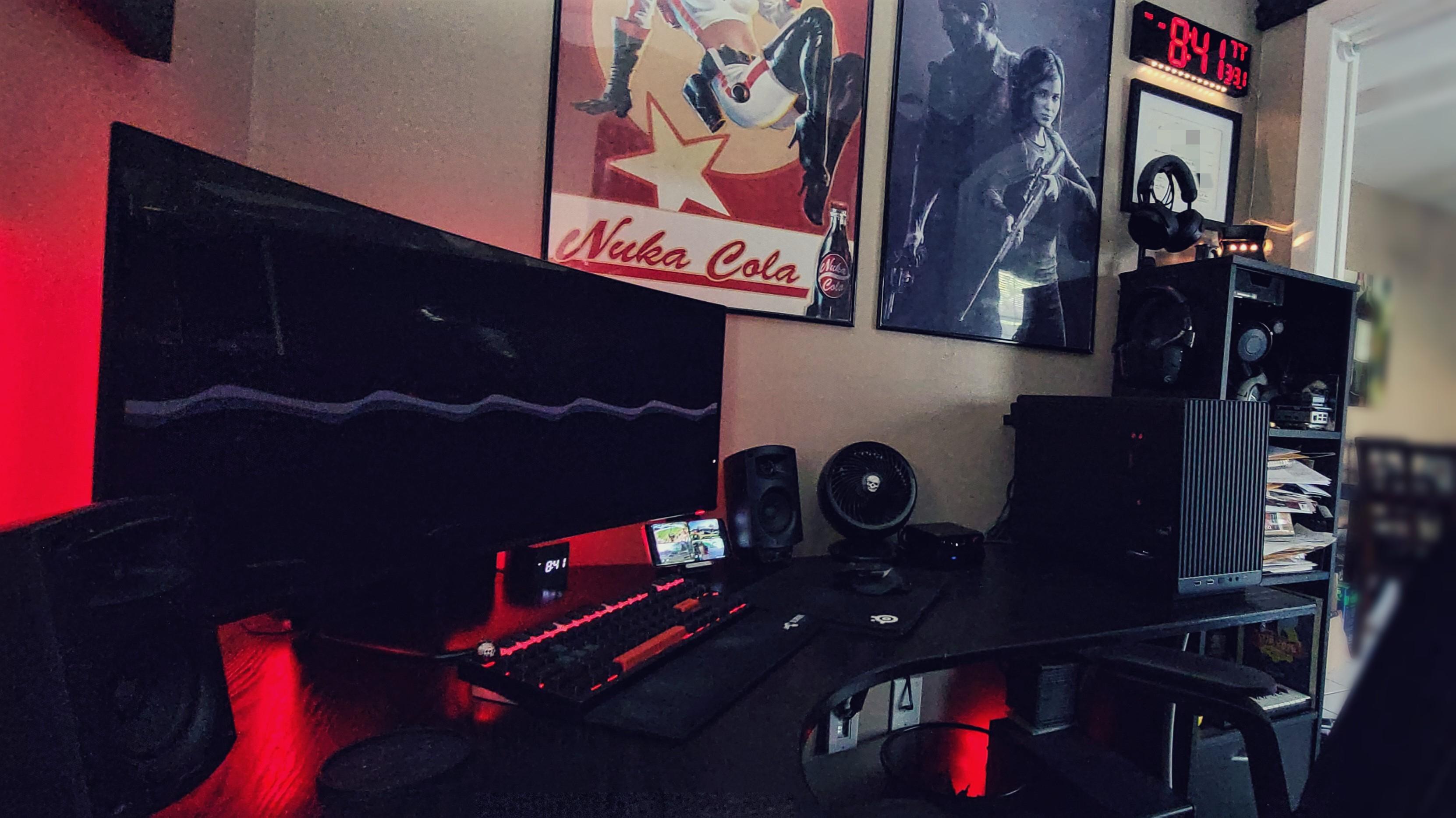 This little room was originally a pantry but I took everything out and turned it into an office when I moved into this house. Finally upgraded my PC too. Was rocking a 3900x with a 2080ti for the past 7 years but it was starting to show its age so I built a new one with a 9800x3D, 32GB RAM and an RTX 5080. Since this case I used is smaller than my previous one I couldn't fit all my drives in it so I have a Terramaster DAS out of frame. I love it