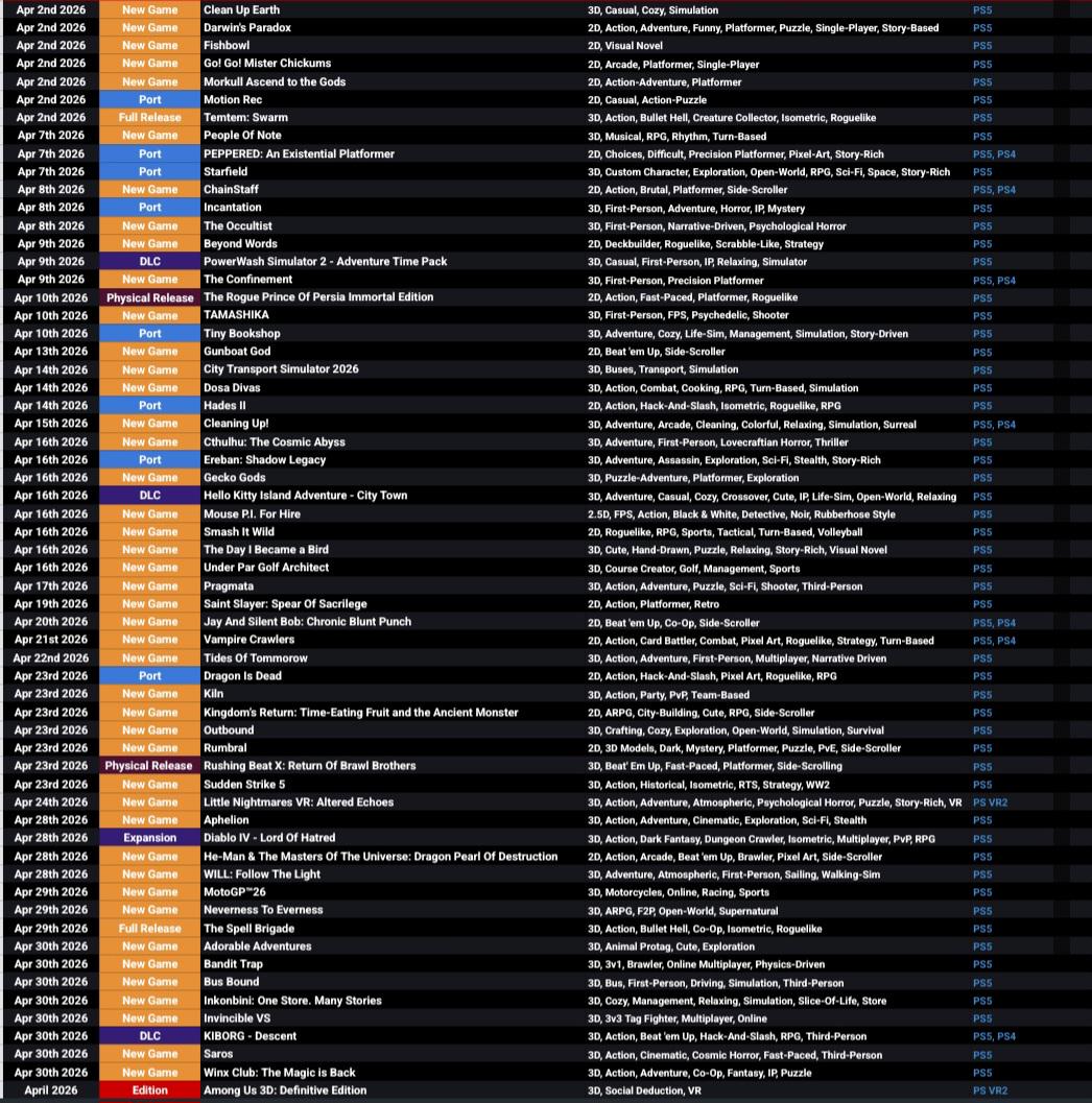 a list of games releasing on PS in april! if i made a mistake let me know, and here is a link to the spreadsheet: https://docs.google.com/spreadsheets/d/1EbGHsJjxt4VrpD8\_0jPZn2JMB7WNz945S1hFgfXWddg/edit?usp=drivesdk Posted by Howerev