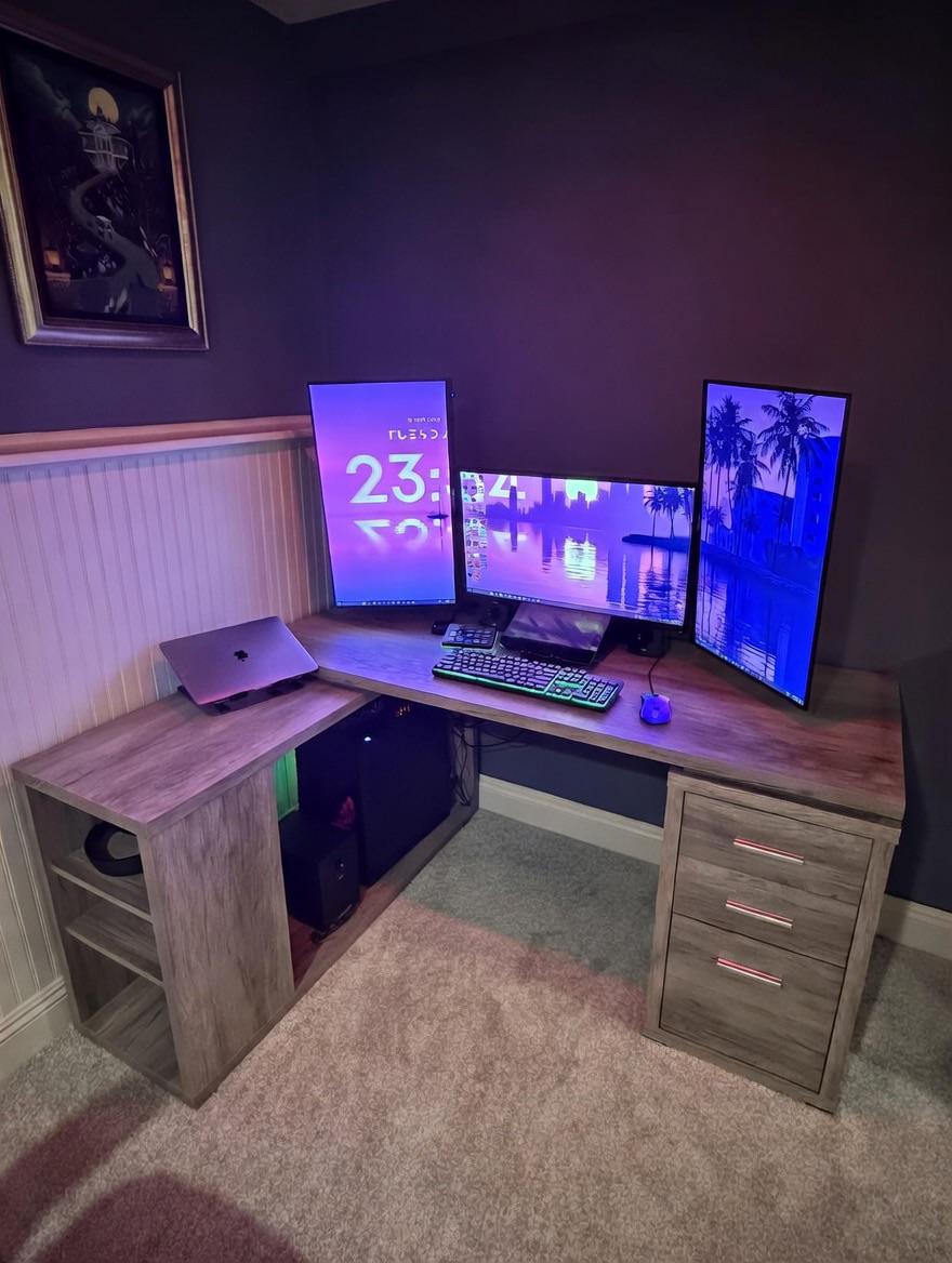 I have been working off of a 24×12 desk the last 3 years so this setup is truly much more spacious. Using this as my all around trading/gaming setup. Recommendations and questions welcome, trying to figure what to put on the wall behind the desk to add some flair