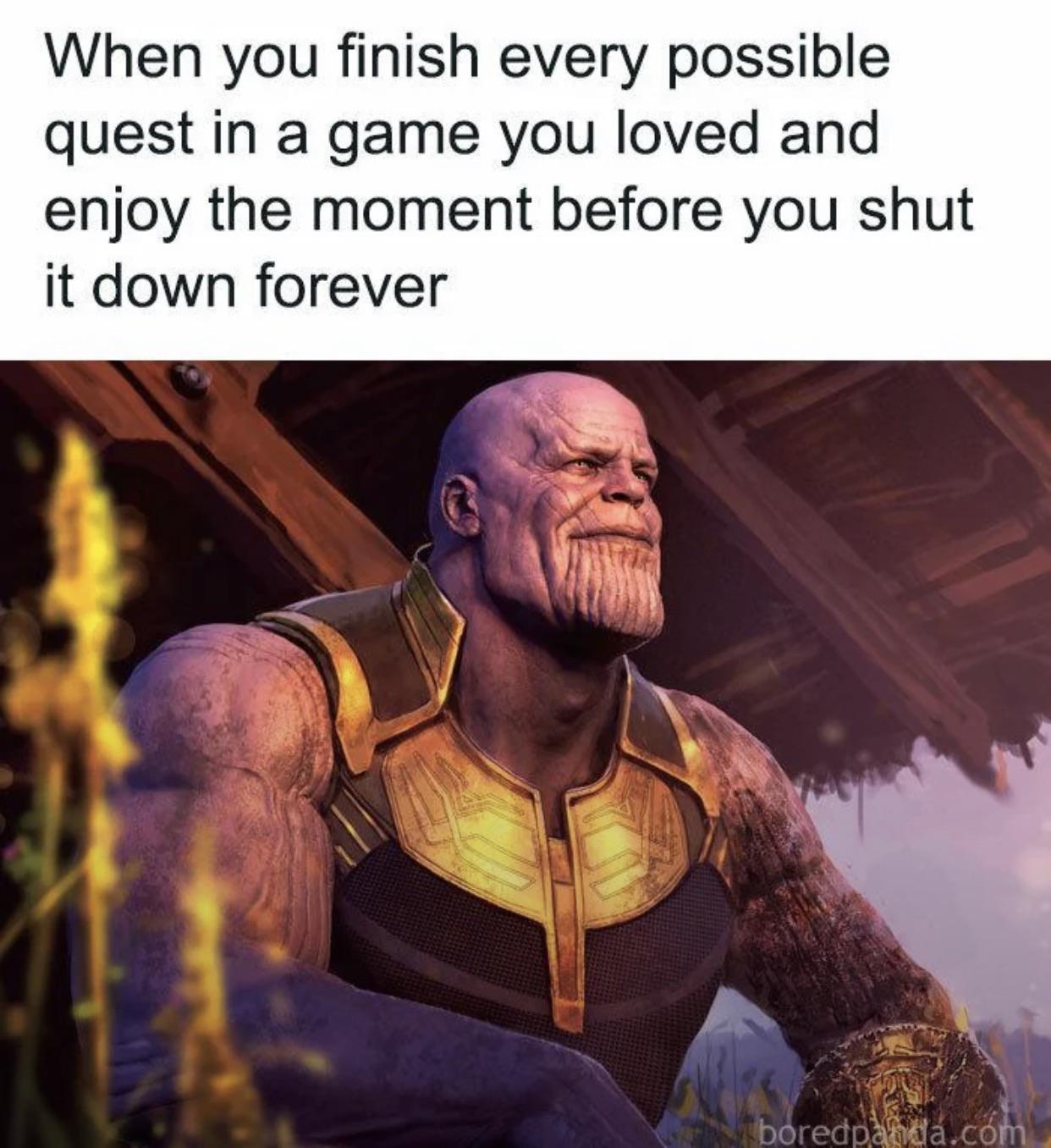 It’s stupidly sentimental, but I remember first doing this in Skyrim. I had platinumed it, done everything I wanted to do, and settled down in my house in Whiterun next to the fire before turning the game off for good. A nice, cozy finish to my adventuring days.