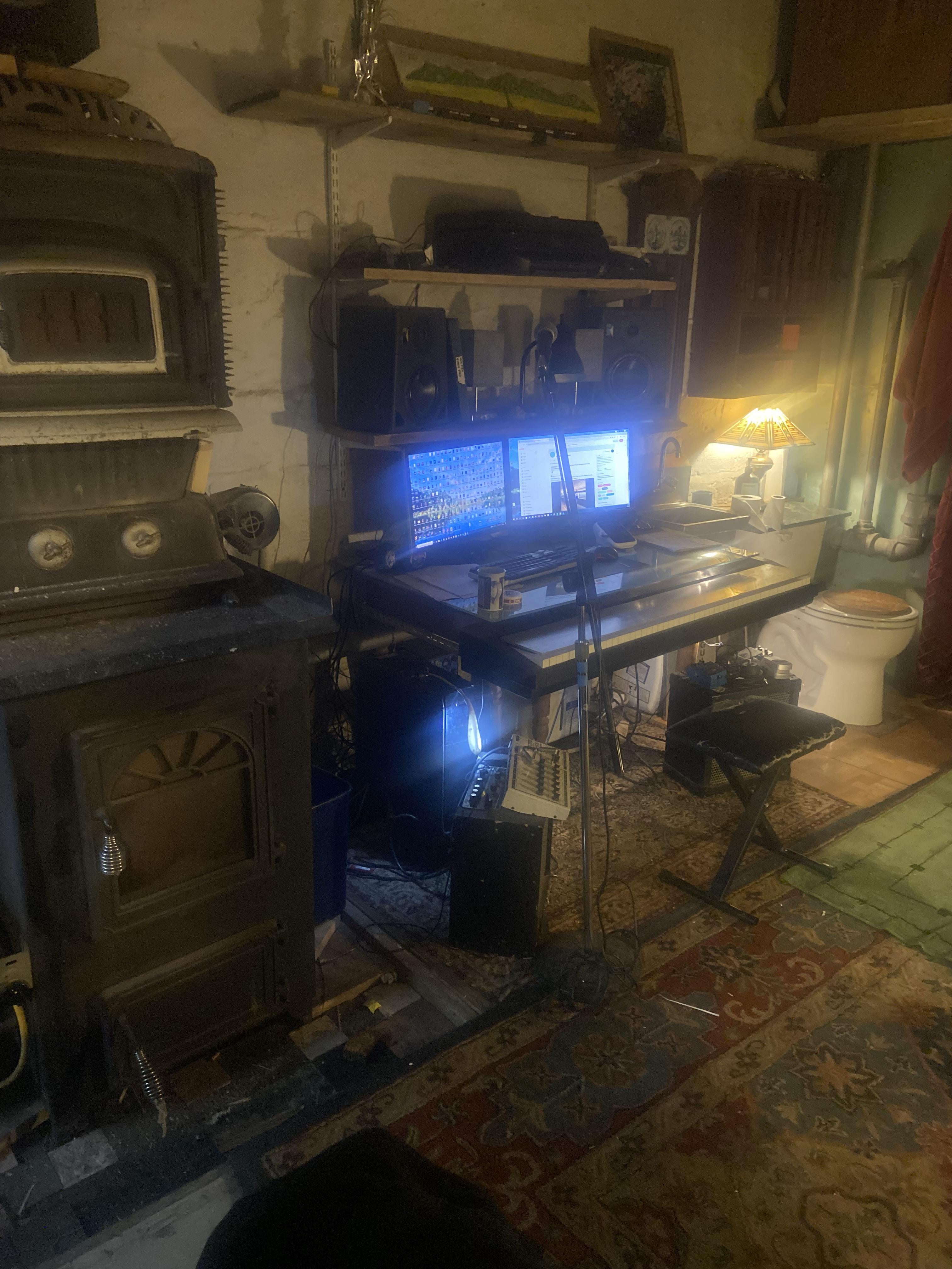 His one stop shop. Barely has to leave the basement for anything. He’s got the wood stove in one side and the toilet on the other. Posted by NefariousnessFew3454