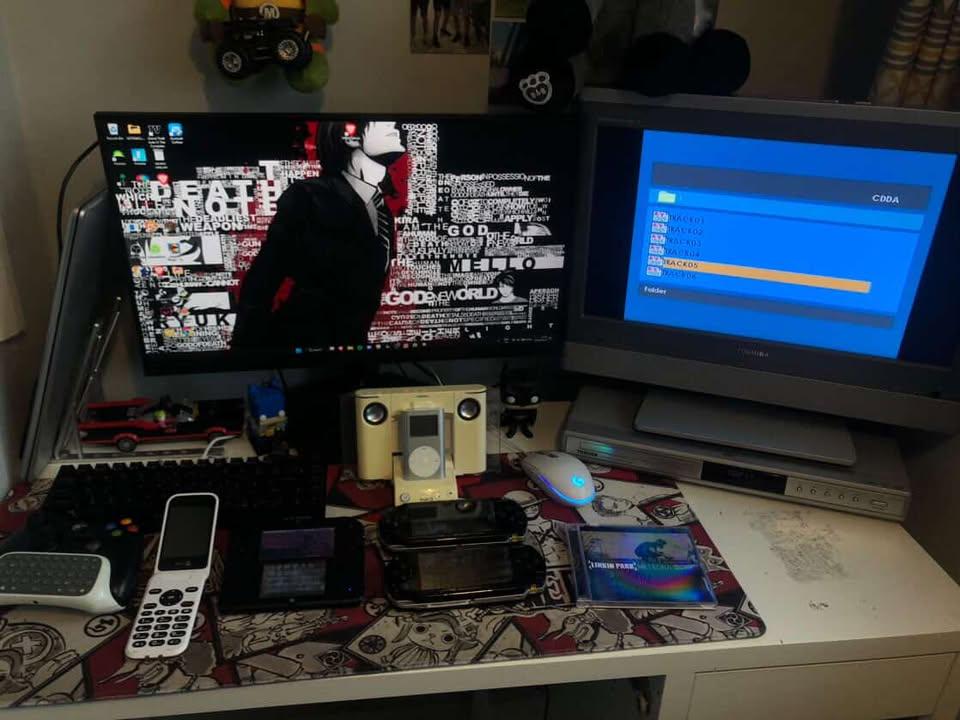 Left side is my main setup (monitor + laptop), and on the right Iâve got a Toshiba TV with a matching DVD player from around 2005/06 (Xbox 360 hooked up just out of frame).