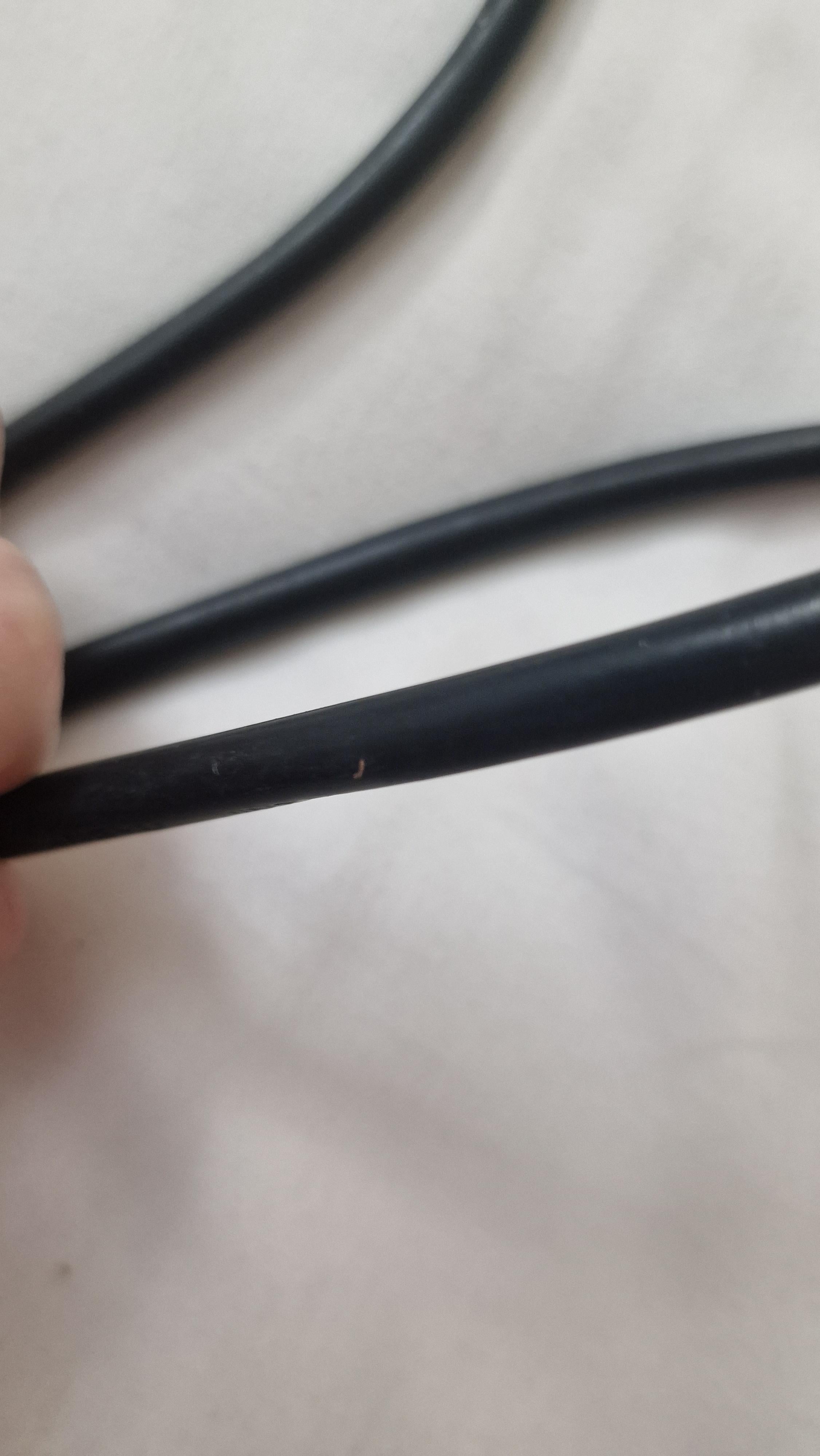 Its a little hard to see but one singular copper wire is sticking out. As far as I can tell, the rubber around it does not have a cut.