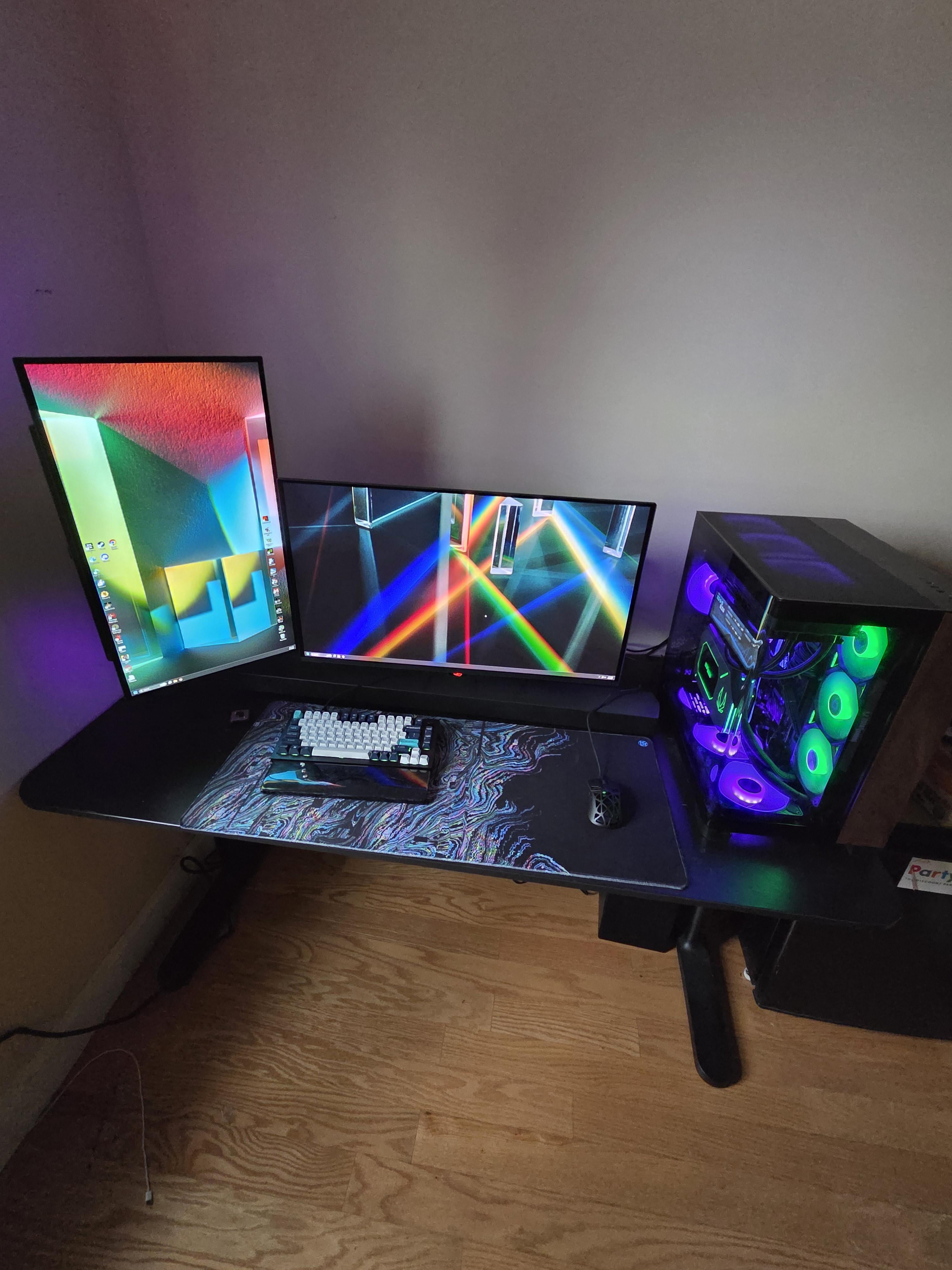 I got some monitor arms up today, eventually want to get a bigger desk, but this is my set up for right now