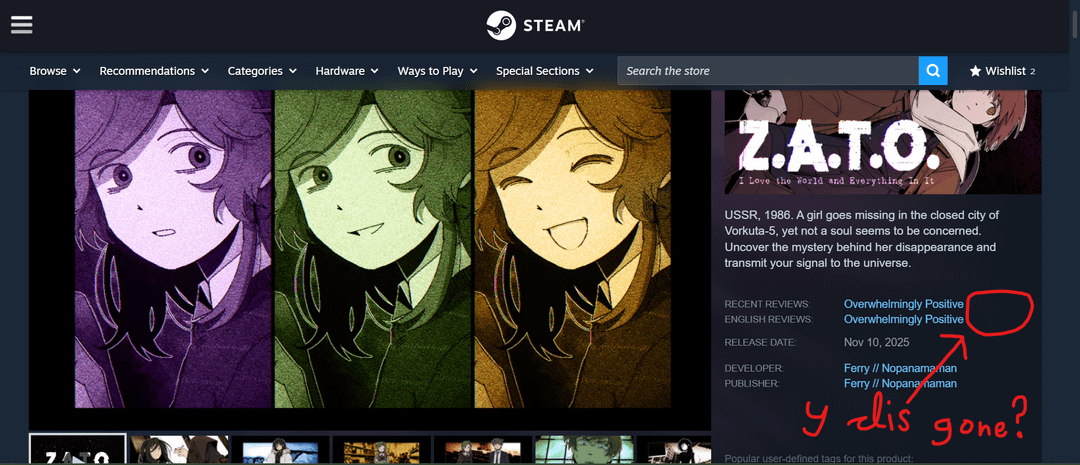Might be a minor issue but it irks me since i'm so used to seeing the review count there, and I swear to god the review numbers were there when I used Steam a few days ago. Now I gotta scroll all the way down to see it unless i'm being an idiot and have some setting accidentally changed or something?