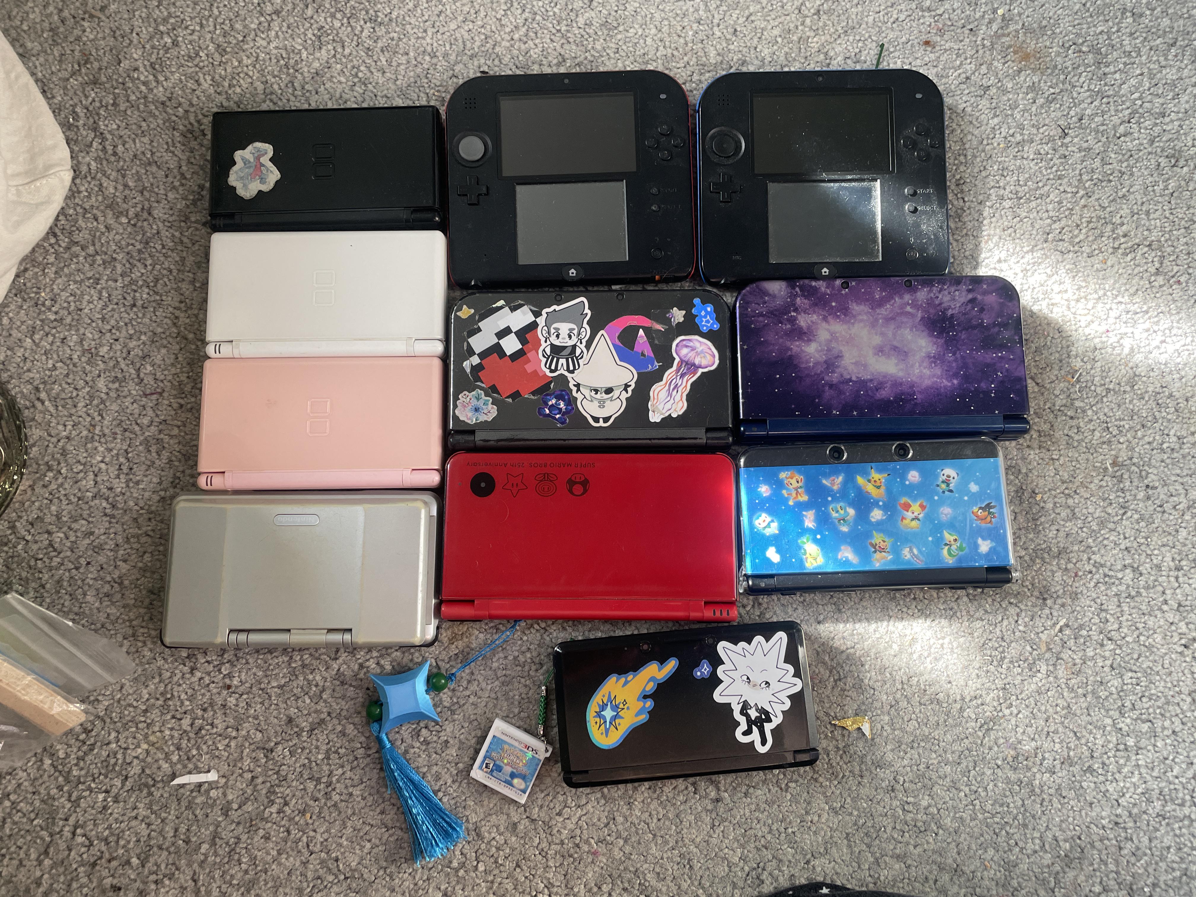almost all of them see use because i like to shiny hunt in pokémon! i am very proud of them all and sometiems like to just sit and look at them all. five of them are modded and the reasons why that isn’t seven is that one of the 2ds’ is on such an old firmware that i kinda wanna keep it like that and i just haven’t gotten a bigger sd card for the o3ds yet.