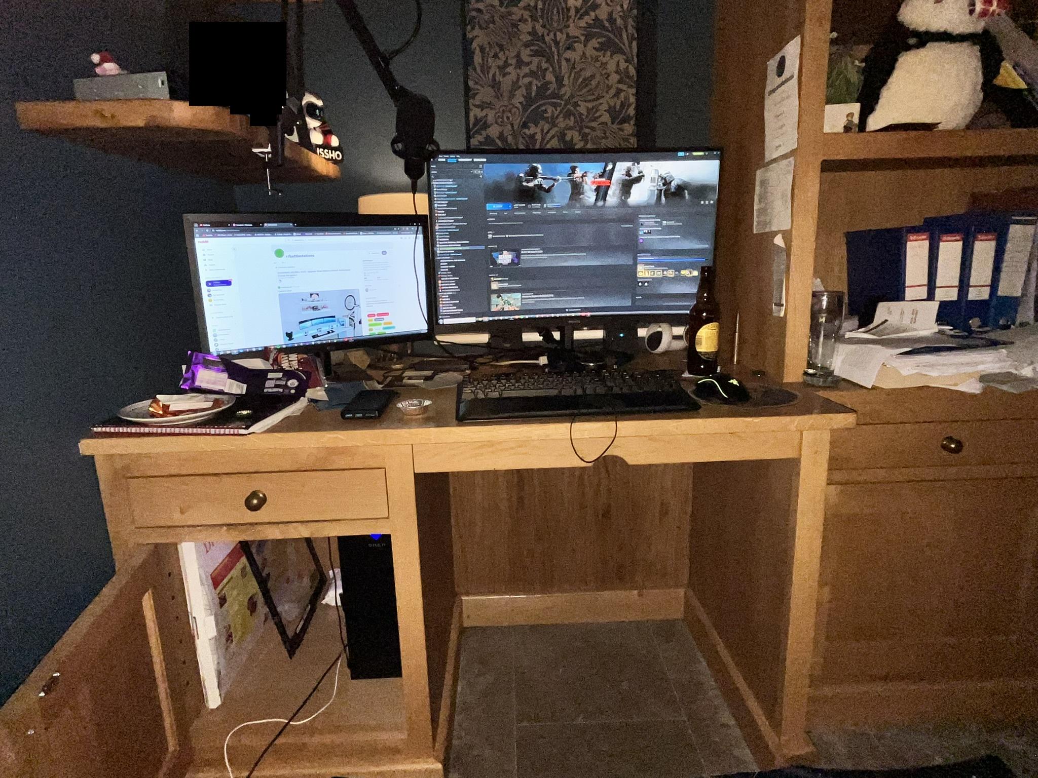 Sudotak mic, razer mouse + keyboard (all the rubber has fallen off the mice and the wrist pad is flaking BADLY). Intel i5 10400, 2060 RTX 6GB, 2.5 TB total storage. Side window taken off for better cooling!